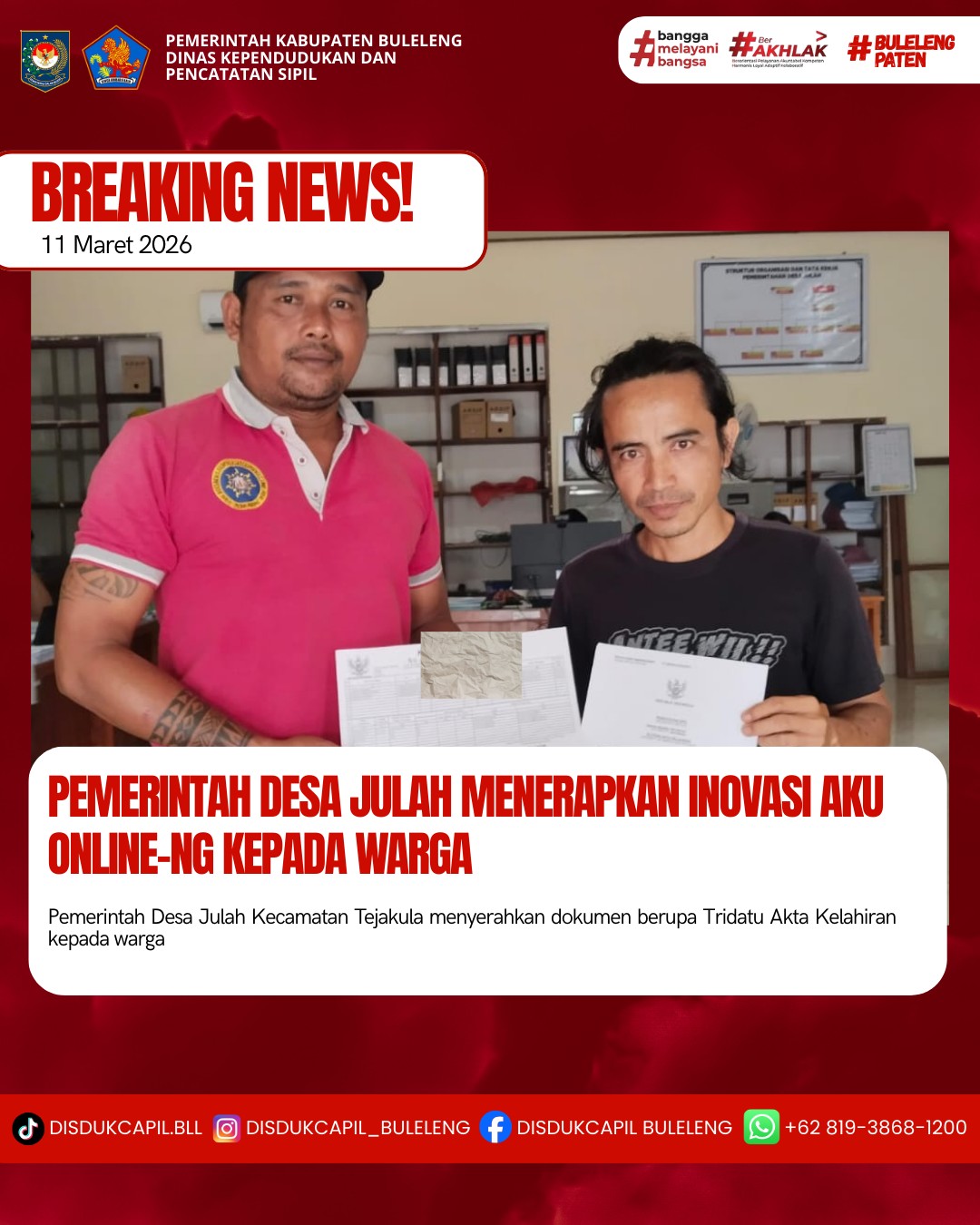 Pemerintah Kabupaten Buleleng melalui Dinas Kependudukan dan Pecatatan Sipil (Disdukcapil) Kabupaten Buleleng memaksimalkan serta mempermudah pelayanan kependudukan masyarakat dengan beberapa inovasi, melalui aplikasi AKU Online-NG. Dimana dalam penerapan aplikasi Aku Online-NG tersebut masyarakat tidak perlu lagi datang ke Dinas Dukcapil untuk melakukan pelayanan langsung cukup dengan datang ke Desa nanti akan dibantu oleh operator Desa masing-masing. Di Desa Julah Kecamatan Tejakula, telah diserahkan dokumen kependudukan berupa Akta Kelahiran atas nama NI KETUT ARNAILA dan Kartu Keluarga atas nama I WAYAN SUMARDA yang beralamat di Banjar Dinas Kanginan, Desa Julah yang diserahkan langsung oleh Kelian Banjar Dinas Kanginan, Desa Julah bertempat di Kantor Perbekel Desa Julah, Kecamatan Tejakula, Kabupaten Buleleng, Rabu (11/3).
