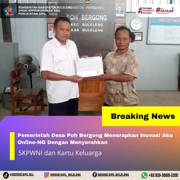 Pemerintah Kabupaten Buleleng melalui Dinas Kependudukan dan Pecatatan Sipil (Disdukcapil) Kabupaten Buleleng memaksimalkan serta mempermudah pelayanan kependudukan masyarakat dengan beberapa inovasi, melalui aplikasi AKU Online. Dimana dalam penerapan aplikasi Aku Online tersebut masyarakat tidak perlu lagi datang ke Dinas Dukcapil untuk melakukan pelayanan langsung cukup dengan datang ke Desa nanti akan dibantu oleh operator Desa masing-masing. Di Desa Poh Bergong Kecamatan Buleleng telah diserahkan dokumen kependudukan berupa SKPWNI dan Kartu Keluarga kepada warga atas nama Ni Komang Sudarmi Desa Poh Bergong Kecamatan Buleleng diserahkan oleh Pemerintahan Desa Poh Bergong, Rabu (29/10).