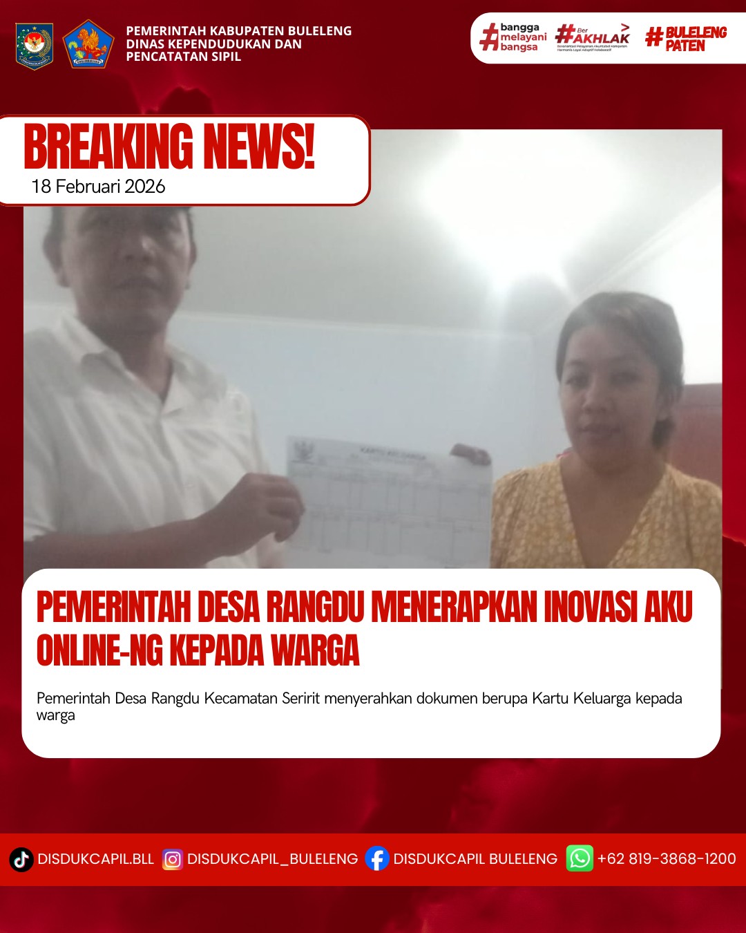 Pemerintah Kabupaten Buleleng melalui Dinas Kependudukan dan Pecatatan Sipil (Disdukcapil) Kabupaten Buleleng memaksimalkan serta mempermudah pelayanan kependudukan masyarakat dengan beberapa inovasi, melalui aplikasi AKU Online. Dimana dalam penerapan aplikasi Aku Online tersebut masyarakat tidak perlu lagi datang ke Dinas Dukcapil untuk melakukan pelayanan langsung cukup dengan datang ke Desa nanti akan dibantu oleh operator Desa masing-masing. Di Desa Rangdu Kecamatan Seririt telah diserahkan dokumen kependudukan berupa Kartu Keluarga atas nama Ketut Ita Seroni diserahkan langsung oleh Kadus Kerta Nadi Kadek Yudi Suardika di Desa Rangdu Kecamatan Seririt, Rabu (18/1).