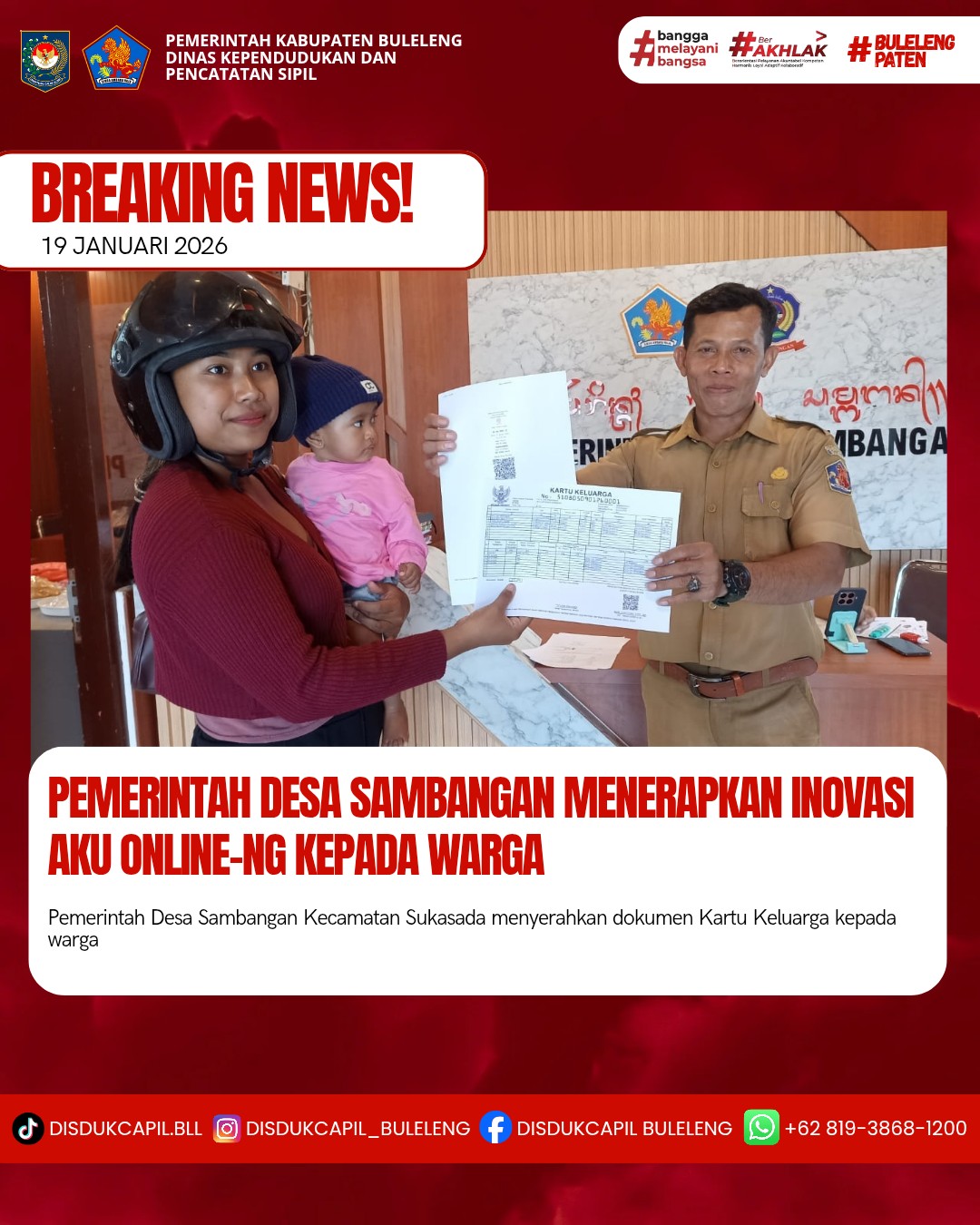 Pemerintah Kabupaten Buleleng melalui Dinas Kependudukan dan Pecatatan Sipil (Disdukcapil) Kabupaten Buleleng memaksimalkan serta mempermudah pelayanan kependudukan masyarakat dengan beberapa inovasi, melalui aplikasi AKU Online-NG. Dimana dalam penerapan aplikasi Aku Online-NG tersebut masyarakat tidak perlu lagi datang ke Dinas Dukcapil untuk melakukan pelayanan langsung cukup dengan datang ke Desa nanti akan dibantu oleh operator Desa masing-masing. Di Desa Sambangan Kecamatan Sukasada, telah diserahkan dokumen kependudukan berupa Kartu Keluarga atas nama Putu Eni Widiasmini warga Banjar Dinas Babakan, diserahkan oleh Pemerintahan Desa Sambangan bertempat di Kantor Perbekel Desa Sambangan, Kecamatan Sukasada, Kabupaten Buleleng, Senin (19/1).