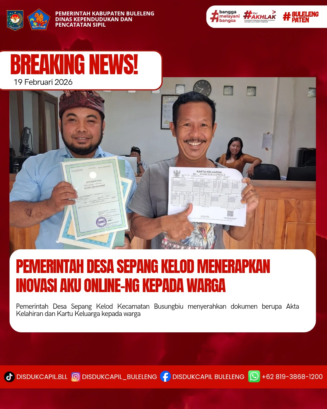 Pemerintah Kabupaten Buleleng melalui Dinas Kependudukan dan Pecatatan Sipil (Disdukcapil) Kabupaten Buleleng memaksimalkan serta mempermudah pelayanan kependudukan masyarakat dengan beberapa inovasi, melalui aplikasi AKU Online. Dimana dalam penerapan aplikasi Aku Online tersebut masyarakat tidak perlu lagi datang ke Dinas Dukcapil untuk melakukan pelayanan langsung cukup dengan datang ke Desa nanti akan dibantu oleh operator Desa masing-masing. Di Desa Sepang Kelod Kecamatan Busungbiu telah diserahkan dokumen kependudukan berupa Akta Kelahiran dan Kartu Keluarga kepada masyarakat BD. Asah Badung, Desa Sepang Kelod, yang diserahkan oleh Kasi Pemerintahan Desa Sepang Kelod, bertempat di Kantor Perbekel Desa Sepang Kelod, Kecamatan Busungbiu, Kamis (19/2).