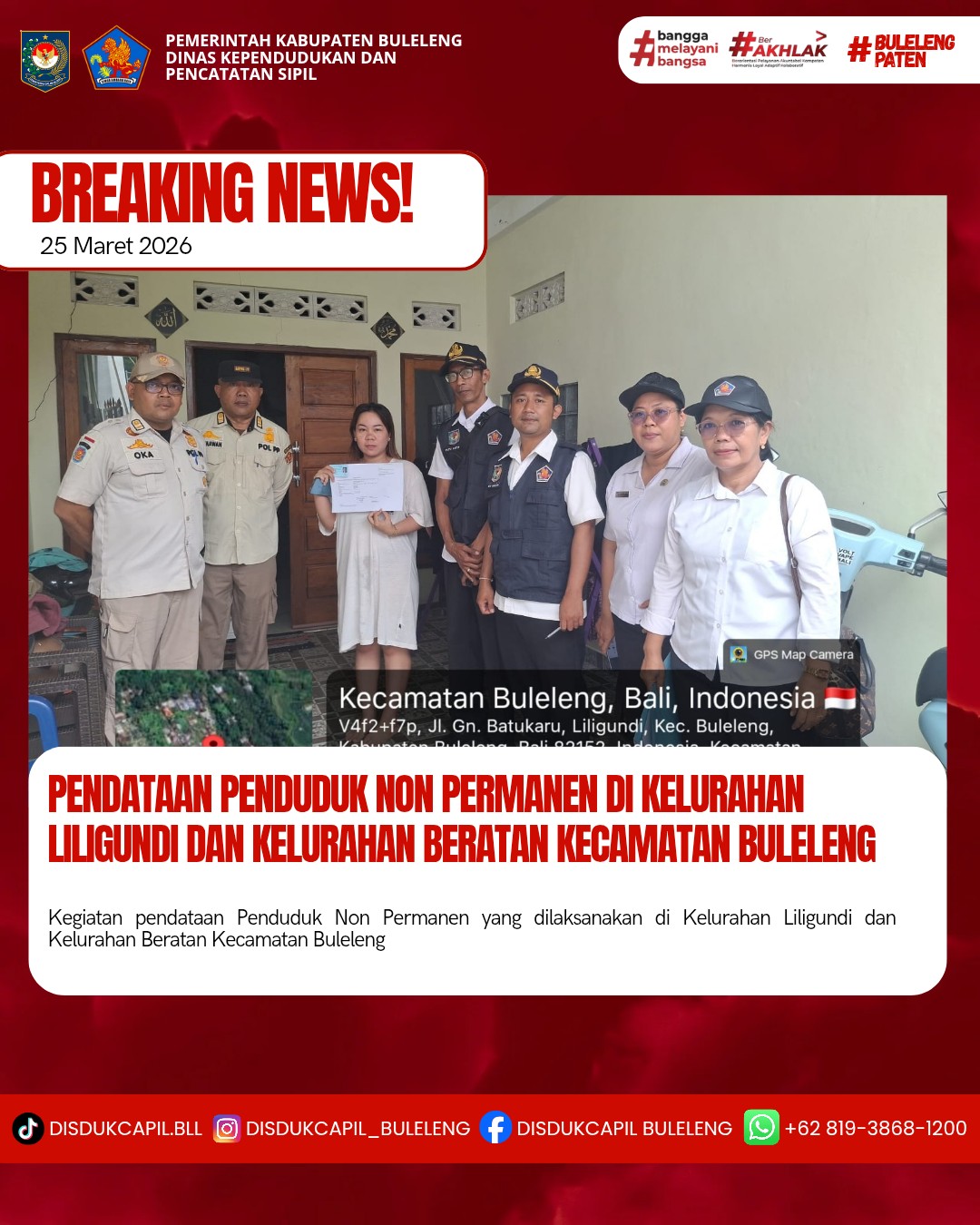 Kali ini Rabu, 25 Maret 2026, Dinas Kependudukan dan Pencatatan Sipil Kabupaten Buleleng melaksanakan kegiatan pendataan penduduk Non Permanen di Kelurahan Liligundi dan Kelurahan Beratan Kecamatan Buleleng. Dari pendataan penduduk kali ini didapatkan hasil :