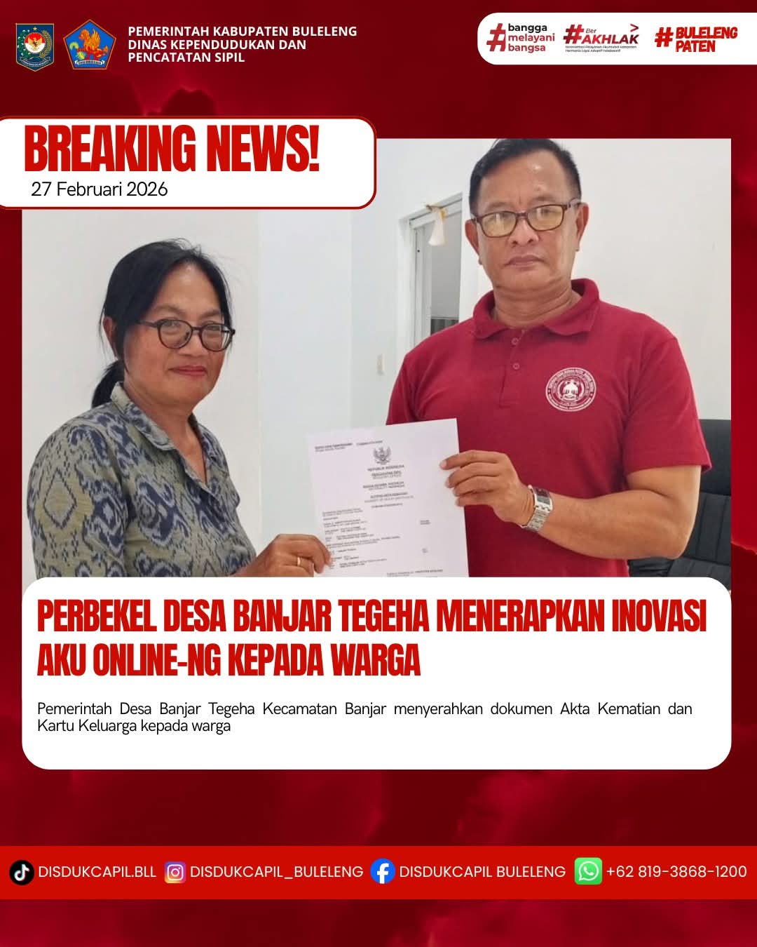 Pemerintah Kabupaten Buleleng melalui Dinas Kependudukan dan Pecatatan Sipil (Disdukcapil) Kabupaten Buleleng memaksimalkan serta mempermudah pelayanan kependudukan masyarakat dengan beberapa inovasi, melalui aplikasi AKU Online-NG. Dimana dalam penerapan aplikasi Aku Online-NG tersebut masyarakat tidak perlu lagi datang ke Dinas Dukcapil untuk melakukan pelayanan langsung cukup dengan datang ke Desa nanti akan dibantu oleh operator Desa masing-masing. Di Desa Banjar Tegeha Kecamatan Banjar, telah diserahkan dokumen kependudukan berupa Akta Kematian atas nama Nyoman Saning dan Kartu Keluarga warga Banjar Dinas Tangeb Desa Banjar Tegeha yang diserahkan secara langsung oleh Perbekel Desa Banjar Tegeha Ida Bagus Komang Sistiadi, Jumat (27/2).