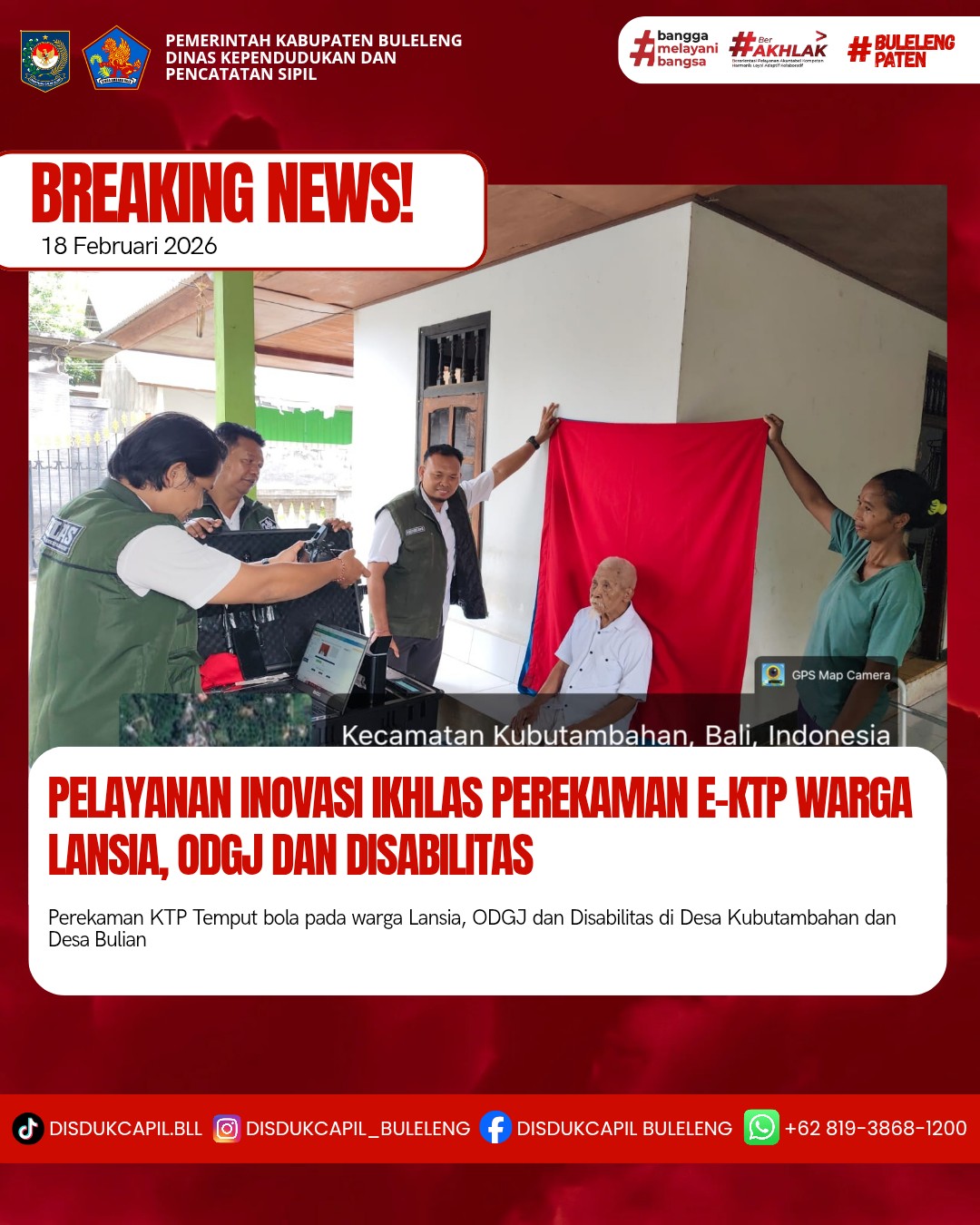 Pada hari ini Rabu, 18 Januari 2026 Dinas Kependudukan dan Pencatatan Sipil Kabupaten Buleleng melaksanakan penerapan Inovasi Ikhlas dengan melakukan jemput bola kepada masyarakat untuk melakukan perekaman KTP-El kepada warga Lansia, ODGJ dan Disabilitas di Desa Kubutambahan dan Desa Bulian atas nama :