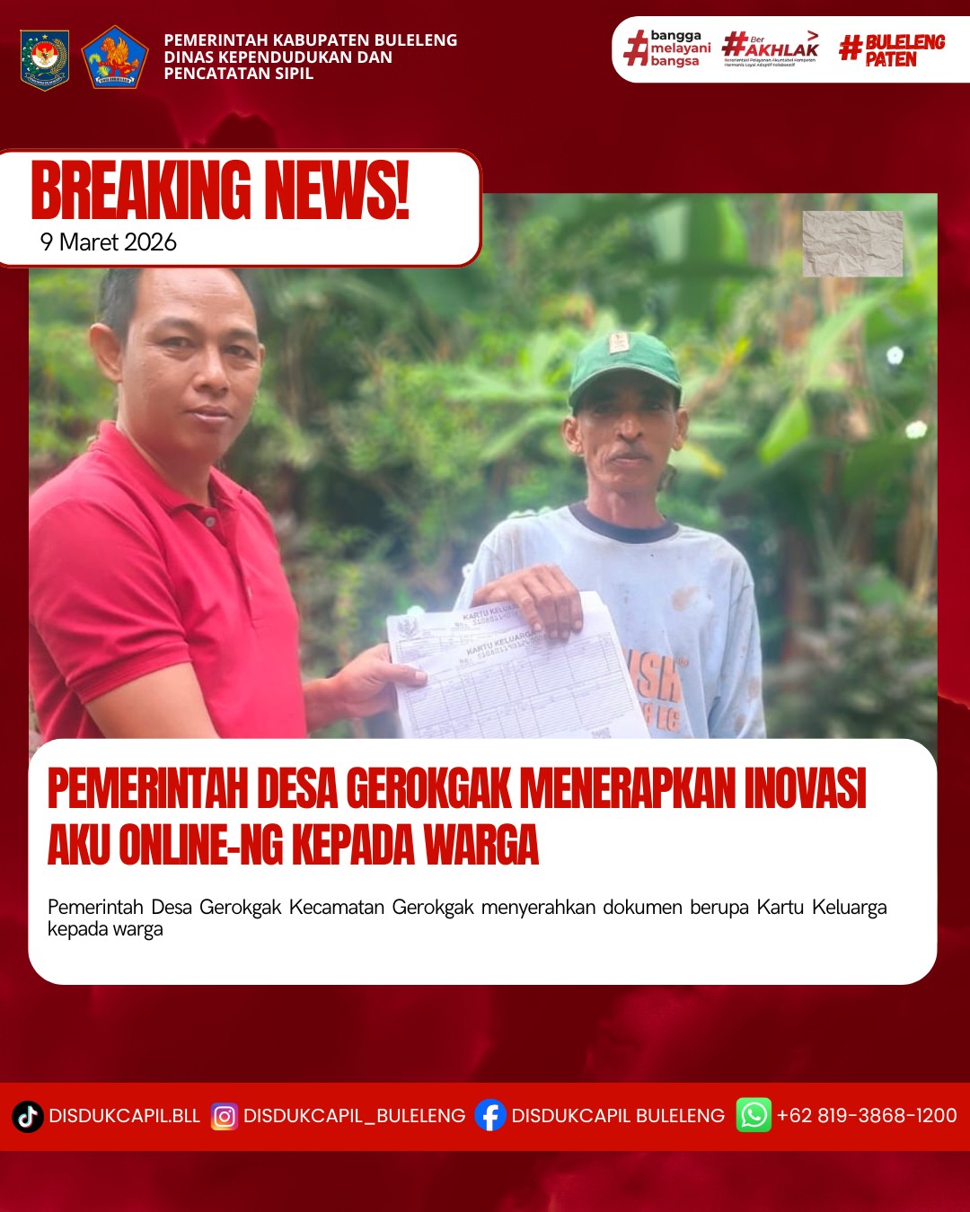 Pemerintah Kabupaten Buleleng melalui Dinas Kependudukan dan Pecatatan Sipil (Disdukcapil) Kabupaten Buleleng memaksimalkan serta mempermudah pelayanan kependudukan masyarakat dengan beberapa inovasi, melalui aplikasi AKU Online-NG. Dimana dalam penerapan aplikasi Aku Online-NG tersebut masyarakat tidak perlu lagi datang ke Dinas Dukcapil untuk melakukan pelayanan langsung cukup dengan datang ke Desa nanti akan dibantu oleh operator Desa masing-masing. Di Desa Gerokgak Kecamatan Gerokgak, telah diserahkan dokumen kependudukan berupa Kartu Keluarga atas nama Nyoman Satria dan Kadek Santri yang diserahkan langsung oleh Kelian Banjar Dinas Batuagung Pidada Desa Gerokgak di Desa Gerokgak, Kecamatan Gerokgak, Kabupaten Buleleng, Senin (9/3).