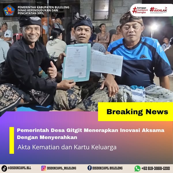 Pemerintah Kabupaten Buleleng melalui Dinas Kependudukan dan Pecatatan Sipil (Disdukcapil) Kabupaten Buleleng memaksimalkan serta mempermudah pelayanan kependudukan masyarakat dengan beberapa inovasi, yakni BALITA (Bayi Lahir Berakta), NYAKSI (Menyerahkan Akta Kawin Saat Acara Perkawinan) dan AKSAMA ( Akta Kematian Diserahkan Saat Masih Berduka) melalui aplikasi Aku Online. Di Desa Gitgit Kecamatan Sukasada, telah diterapkan program Aksama (Akta Kematian Diserahkan Saat Masih Berduka) yang dilakukan secara langsung oleh klian Banjar Dinas Pumahan Desa Gitgit dengan menyerahkan Akta Kematian atas nama Wayan camplung dan Kartu Keluarga kepada warga di Desa Gitgit Kecamatan Sukasada, Kamis(16/10).