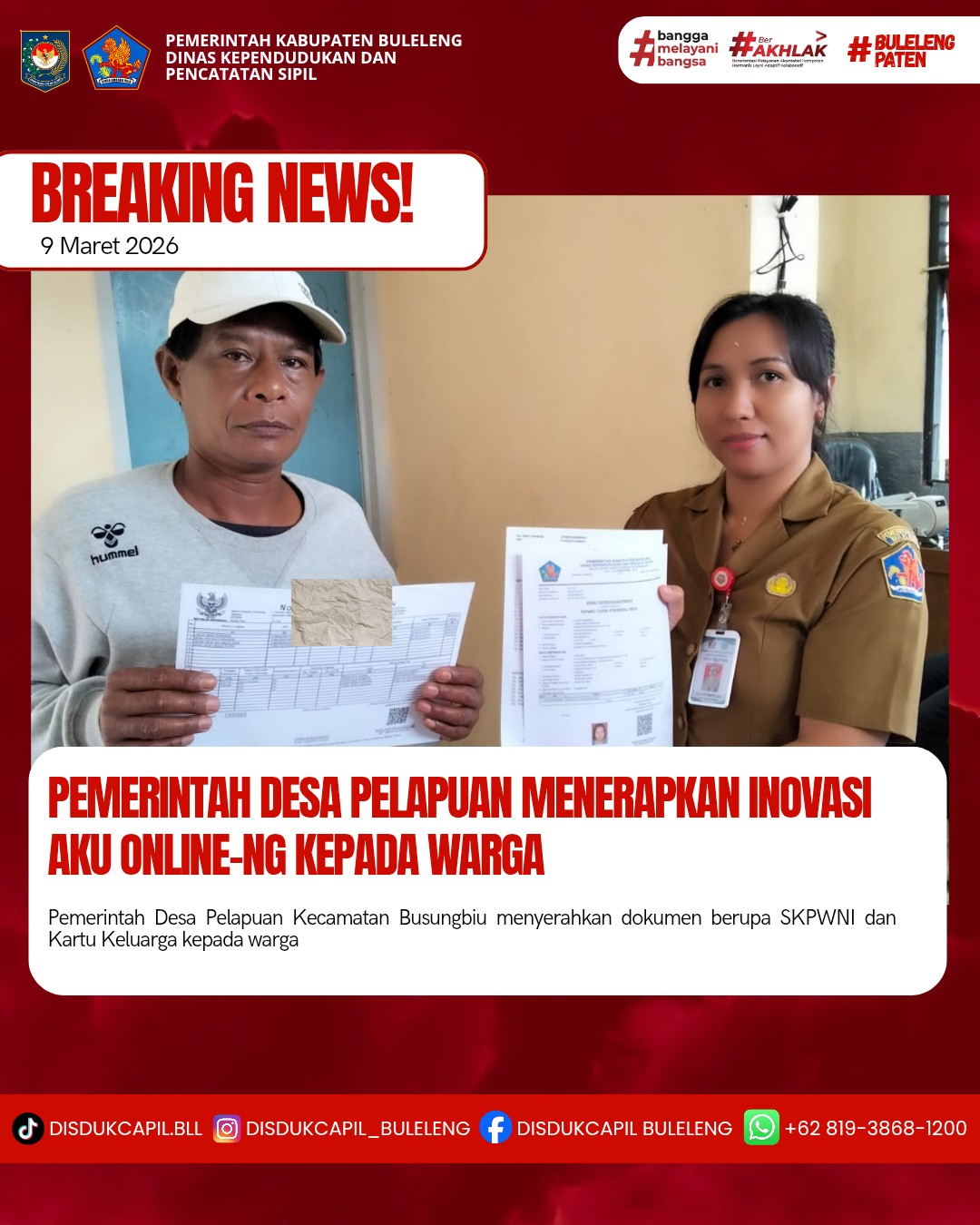 Pemerintah Kabupaten Buleleng melalui Dinas Kependudukan dan Pecatatan Sipil (Disdukcapil) Kabupaten Buleleng memaksimalkan serta mempermudah pelayanan kependudukan masyarakat dengan beberapa inovasi, melalui aplikasi AKU Online-NG. Dimana dalam penerapan aplikasi Aku Online-NG tersebut masyarakat tidak perlu lagi datang ke Dinas Dukcapil untuk melakukan pelayanan langsung cukup dengan datang ke Desa nanti akan dibantu oleh operator Desa masing-masing. Di Desa Pelapuan Kecamatan Busungbiu, telah diserahkan dokumen kependudukan berupa Kartu Keluarga atas nama I Dewa Gede Suarjana , SKPWNI dan biodata an. Desak Putu Lingga Sari Dewi. yang diserahkan oleh Kasi Pemerintahan Desa Pelapuan bertempat di Kantor Perbekel Desa Pelapuan, Kecamatan Busungbiu, Kabupaten Buleleng, Senin (9/3).