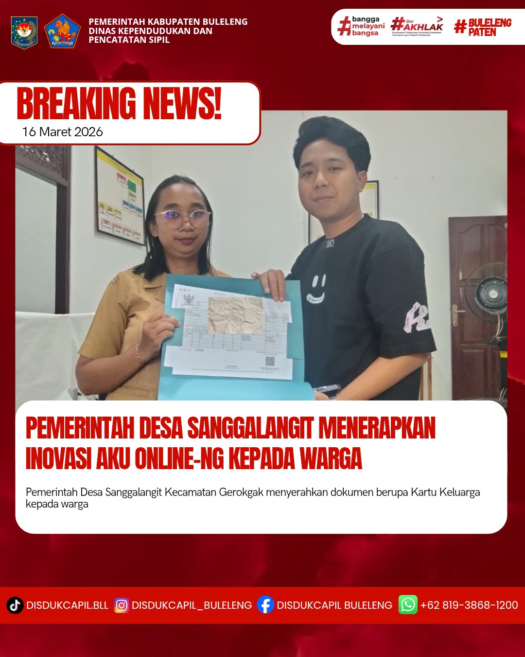 Pemerintah Kabupaten Buleleng melalui Dinas Kependudukan dan Pecatatan Sipil (Disdukcapil) Kabupaten Buleleng memaksimalkan serta mempermudah pelayanan kependudukan masyarakat dengan beberapa inovasi, melalui aplikasi AKU Online-NG. Dimana dalam penerapan aplikasi Aku Online-NG tersebut masyarakat tidak perlu lagi datang ke Dinas Dukcapil untuk melakukan pelayanan langsung cukup dengan datang ke Desa nanti akan dibantu oleh operator Desa masing-masing. Di Desa Sanggalangit Kecamatan Gerokgak, telah diserahkan dokumen kependudukan berupa Kartu Keluarga kepada warga atas nama Made Suriana warga Banjar Dinas Kayuputih Desa Sanggalangit Kecamatan Gerokgak yang diserahkan langsung oleh Operator Aku Online, Desa Sanggalangit, Senin (16/3).