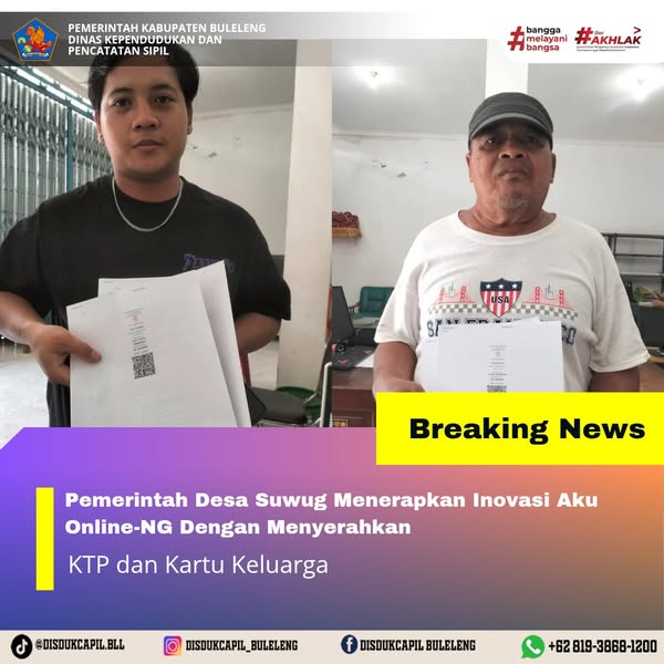Pemerintah Kabupaten Buleleng melalui Dinas Kependudukan dan Pecatatan Sipil (Disdukcapil) Kabupaten Buleleng memaksimalkan serta mempermudah pelayanan kependudukan masyarakat dengan beberapa inovasi, melalui aplikasi AKU Online-NG. Dimana dalam penerapan aplikasi Aku Online-NG tersebut masyarakat tidak perlu lagi datang ke Dinas Dukcapil untuk melakukan pelayanan langsung cukup dengan datang ke Desa nanti akan dibantu oleh operator Desa masing-masing. Di Desa Suwug Kecamatan Sawan, telah diserahkan dokumen kependudukan berupa e-KTP dan Kartu Keluarga yang diserahkan secara langsung oleh Kasi Pemerintahan Desa Suwug, Selasa (7/10).