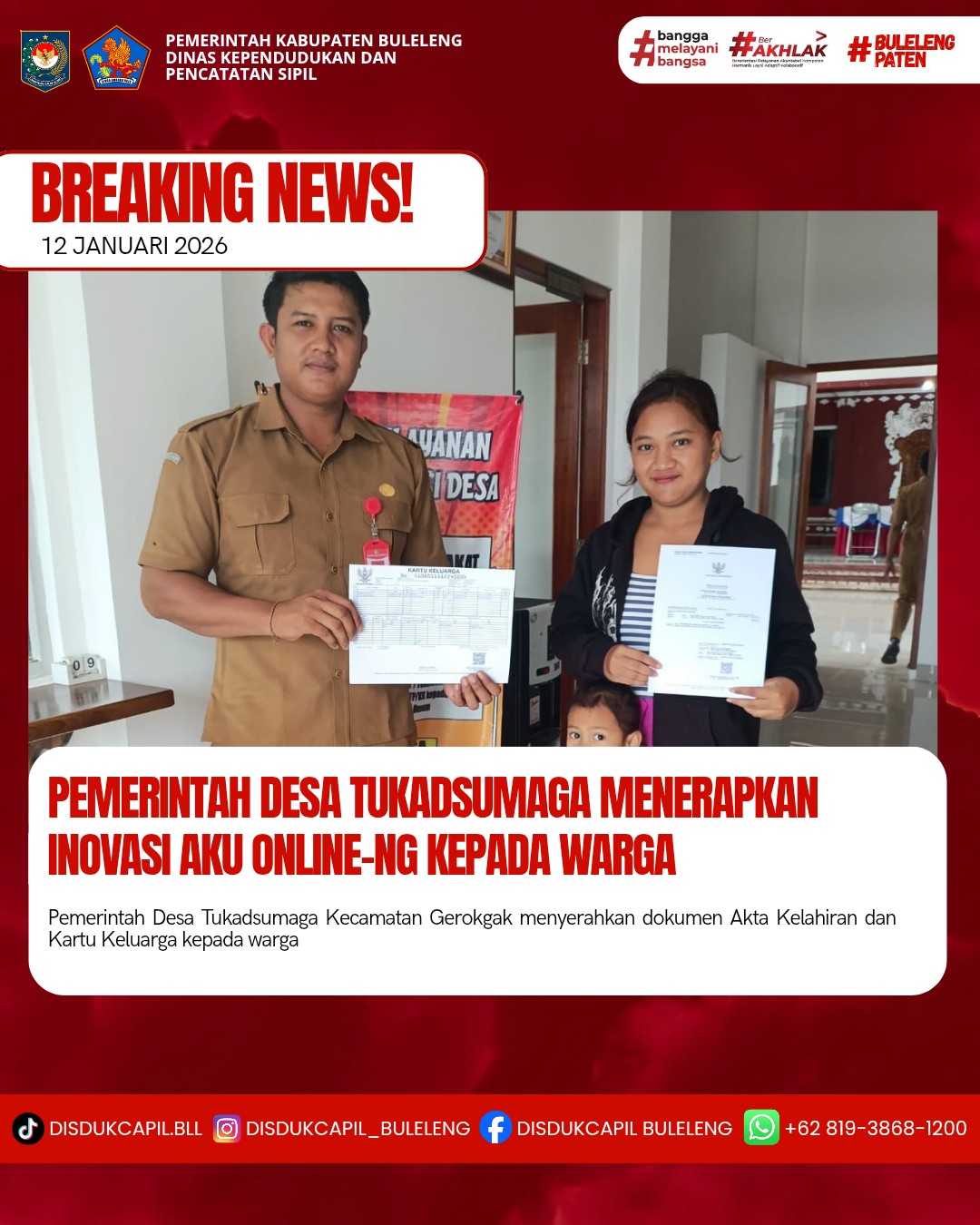 Pemerintah Kabupaten Buleleng melalui Dinas Kependudukan dan Pecatatan Sipil (Disdukcapil) Kabupaten Buleleng memaksimalkan serta mempermudah pelayanan kependudukan masyarakat dengan beberapa inovasi, melalui aplikasi AKU Online-NG. Dimana dalam penerapan aplikasi Aku Online-NG tersebut masyarakat tidak perlu lagi datang ke Dinas Dukcapil untuk melakukan pelayanan langsung cukup dengan datang ke Desa nanti akan dibantu oleh operator Desa masing-masing. Di Desa Tukadsumaga Kecamatan Gerokgak, telah diserahkan dokumen kependudukan berupa Akta Kelahiran atas nama NI LUH GIA SANJIWANI dan Kartu Keluarga atas nama KADEK AYU NADIYA warga Desa Tukadsumaga Kecamatan Gerokgak yang diserahkan oleh Pemerintah Desa Tukadsumaga di Desa Tukadsumaga, Senin (12/1).