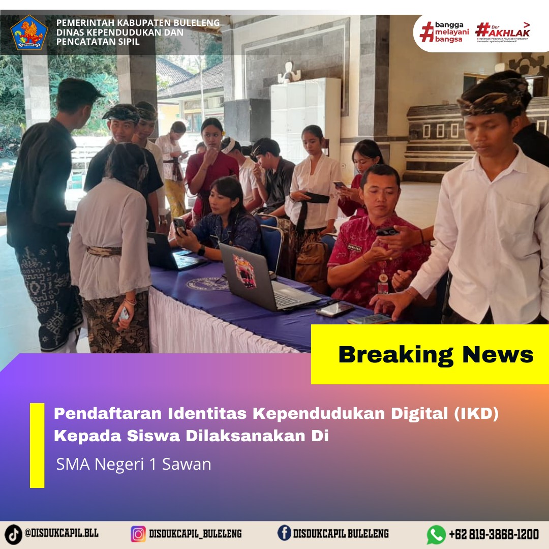 Menerapkan aturan pemerintah tersebut, Dinas Kependudukan dan Pencatatan Sipil Kabupaten Buleleng menyelenggarakan Pendaftaran Identitas Kependudukan Digital ke sekolah-sekolah, Dinas, Lembaga dan Perusahaan secara bergilir setiap harinya. Kali ini pelaksanaan pendaftaran Identitas Kependudukan Digital kepada Siswa dan Guru yang dilaksanakan di SMA Negeri 1 Sawan, Kamis (25/9).