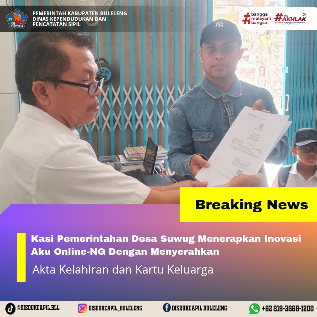 Pemerintah Kabupaten Buleleng melalui Dinas Kependudukan dan Pecatatan Sipil (Disdukcapil) Kabupaten Buleleng memaksimalkan serta mempermudah pelayanan kependudukan masyarakat dengan beberapa inovasi, melalui aplikasi AKU Online. Dimana dalam penerapan aplikasi Aku Online tersebut masyarakat tidak perlu lagi datang ke Dinas Dukcapil untuk melakukan pelayanan langsung cukup dengan datang ke Desa nanti akan dibantu oleh operator Desa masing-masing. Di Desa Suwug Kecamatan Sawan telah diserahkan dokumen kependudukan berupa Akta Kelahiran dan Kartu Keluarga yang diserahkan oleh Kasi Pemerintahan Desa Suwug Kecamatan Sawan, Jumat (26/9).