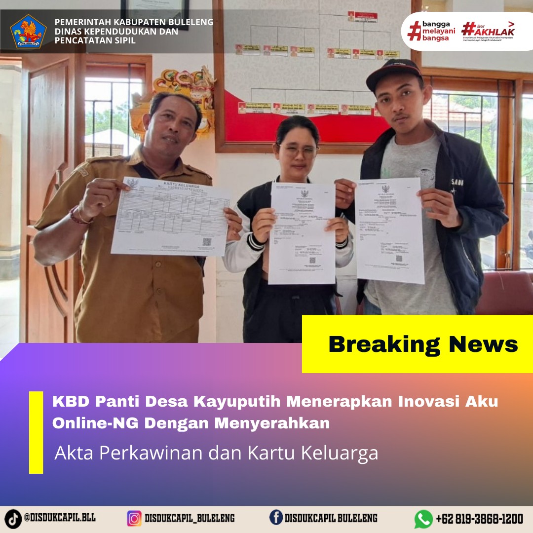 Pemerintah Kabupaten Buleleng melalui Dinas Kependudukan dan Pecatatan Sipil (Disdukcapil) Kabupaten Buleleng memaksimalkan serta mempermudah pelayanan kependudukan masyarakat dengan beberapa inovasi, melalui aplikasi AKU Online-NG. Dimana dalam penerapan aplikasi Aku Online-NG tersebut masyarakat tidak perlu lagi datang ke Dinas Dukcapil untuk melakukan pelayanan langsung cukup dengan datang ke Desa nanti akan dibantu oleh operator Desa masing-masing. Di Desa Kayuputih Kecamatan Sukasada, telah diserahkan dokumen kependudukan berupa Akta Perkawinan dan Kartu Keluarga atas nama Gede Opa Cemerti Mustika yang diserahkan langsung oleh Kelian Banjar Dinas Panti Desa Kayuputih Kecamatan Sukasada bertempat di kantor Perbekel Desa Kayuputih, Kecamatan Sukasada, Kabupaten Buleleng, Selasa (9/9).