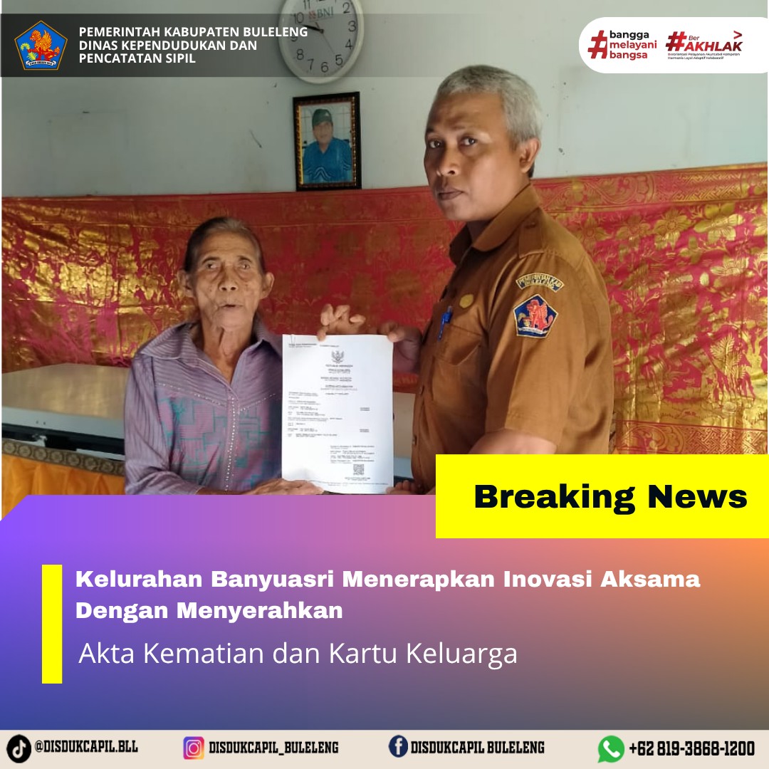 Pemerintah Kabupaten Buleleng melalui Dinas Kependudukan dan Pecatatan Sipil (Disdukcapil) Kabupaten Buleleng memaksimalkan serta mempermudah pelayanan kependudukan masyarakat dengan beberapa inovasi, yakni BALITA (Bayi Lahir Berakta), NYAKSI (Menyerahkan Akta Kawin Saat Acara Perkawinan) dan AKSAMA ( Akta Kematian Diserahkan Saat Masih Berduka) melalui aplikasi Aku Online. Di Kelurahan Banyuasri Kecamatan Buleleng, telah diterapkan program Aksama (Akta Kematian Diserahkan Saat Masih Berduka) yang dilakukan secara langsung oleh Kaling Kelurahan Banyuasri dengan menyerahkan Akta Kematian atas nama Ketut Winaca dan Kartu Keluarga yang beralamat di jalan Sudirman gang VII No. 4 Kelurahan Banyuasri, Senin (17/11).