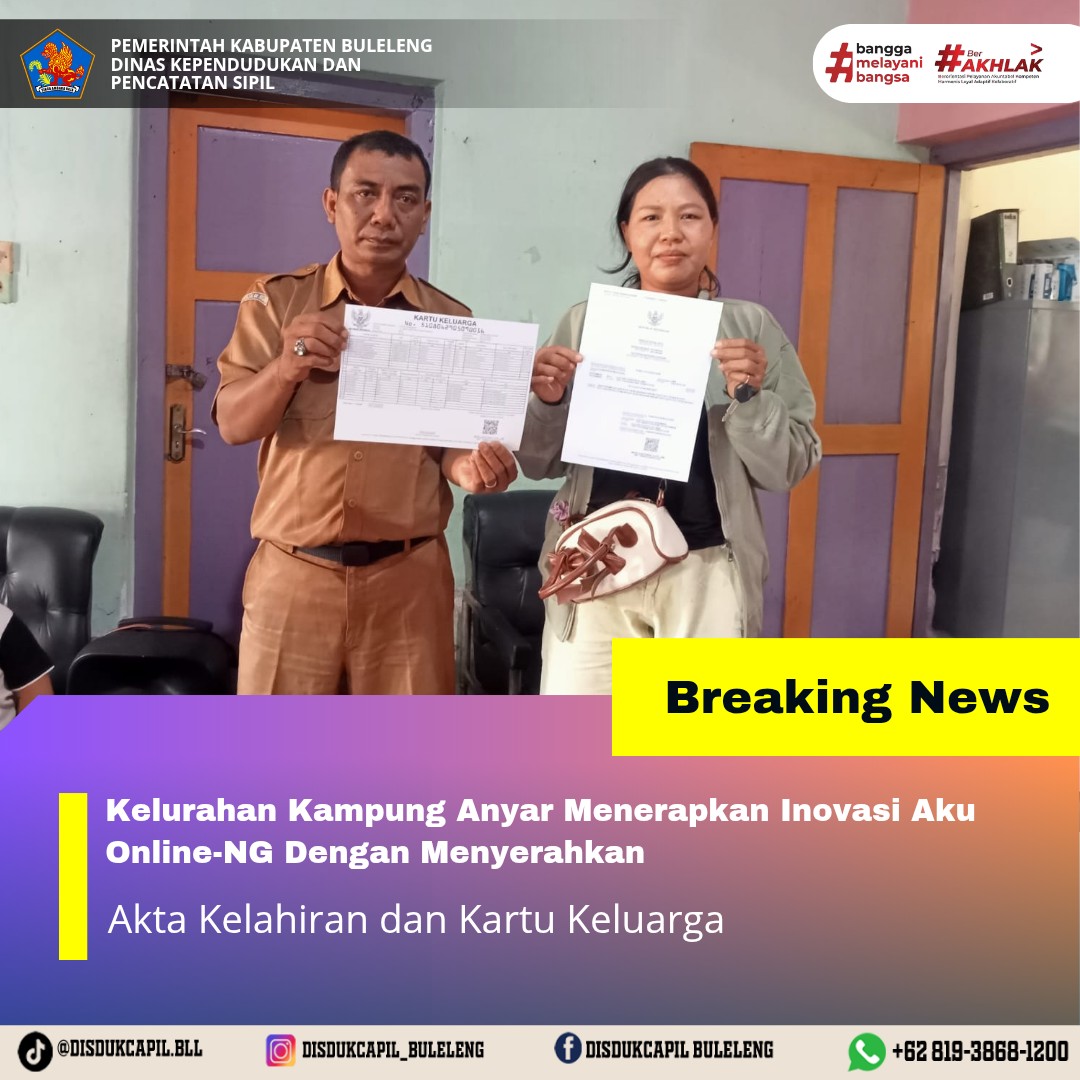 Pemerintah Kabupaten Buleleng melalui Dinas Kependudukan dan Pecatatan Sipil (Disdukcapil) Kabupaten Buleleng memaksimalkan serta mempermudah pelayanan kependudukan masyarakat dengan beberapa inovasi, melalui aplikasi AKU Online-NG. Dimana dalam penerapan aplikasi Aku Online-NG tersebut masyarakat tidak perlu lagi datang ke Dinas Dukcapil untuk melakukan pelayanan langsung cukup dengan datang ke Desa nanti akan dibantu oleh operator Desa masing-masing. Di Kelurahan Kampung Anyar Kecamatan Buleleng, telah diserahkan dokumen kependudukan berupa Akta Kelahiran atas nama Gede Ariawan yang diserahkan langsung oleh Kelurahan Kampung Anyar Kecamatan Buleleng, Kabupaten Buleleng, Senin (22/12).