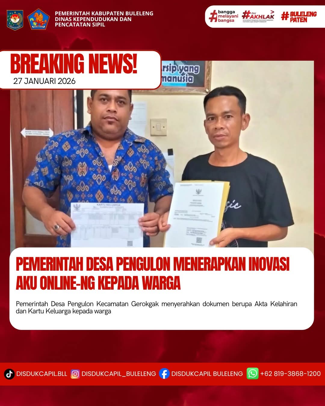 Pemerintah Kabupaten Buleleng melalui Dinas Kependudukan dan Pecatatan Sipil (Disdukcapil) Kabupaten Buleleng memaksimalkan serta mempermudah pelayanan kependudukan masyarakat dengan beberapa inovasi, melalui aplikasi AKU Online-NG. Dimana dalam penerapan aplikasi Aku Online-NG tersebut masyarakat tidak perlu lagi datang ke Dinas Dukcapil untuk melakukan pelayanan langsung cukup dengan datang ke Desa nanti akan dibantu oleh operator Desa masing-masing. Di Desa Pengulon Kecamatan Gerokgak, telah diserahkan dokumen kependudukan berupa Akta Kelahiran atas nama Ketut Ayu Nitayani dan Kartu Keluarga atas nama Nyoman Wirawan yang diserahkan secara langsung oleh Kasi Pemerintahan Desa Pengulon Kecamatan Gerokgak , Selasa (27/1).
