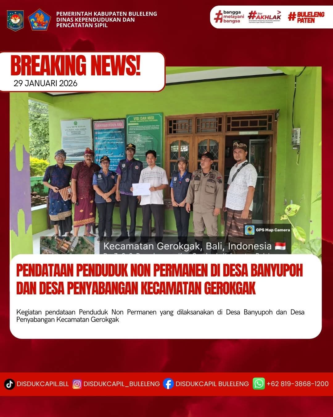 Kali ini Kamis, 29 Januari 2026, Dinas Kependudukan dan Pencatatan Sipil Kabupaten Buleleng melaksanakan kegiatan pendataan penduduk Non Permanen di Desa Banyupoh dan Desa Penyabangan Kecamatan Gerokgak. Dari pendataan penduduk kali ini didapatkan hasil :