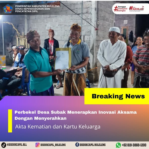 Pemerintah Kabupaten Buleleng melalui Dinas Kependudukan dan Pecatatan Sipil (Disdukcapil) Kabupaten Buleleng memaksimalkan serta mempermudah pelayanan kependudukan masyarakat dengan beberapa inovasi, yakni BALITA (Bayi Lahir Berakta), NYAKSI (Menyerahkan Akta Kawin Saat Acara Perkawinan) dan AKSAMA ( Akta Kematian Diserahkan Saat Masih Berduka) melalui aplikasi Aku Online. Di Desa Tukadsumaga Kecamatan Gerokgak, telah diterapkan program Aksama (Akta Kematian Diserahkan Saat Masih Berduka) yang dilakukan secara langsung oleh Perbekel Desa Subak dengan menyerahkan Akta Kematian atas nama MADE WIDIASIH dan Kartu Keluarga yang diterima langsung oleh keluarganya atas nama Putu Suriasa di Desa Subuk , Kecamatan Busungbiu, Rabu (8/10).