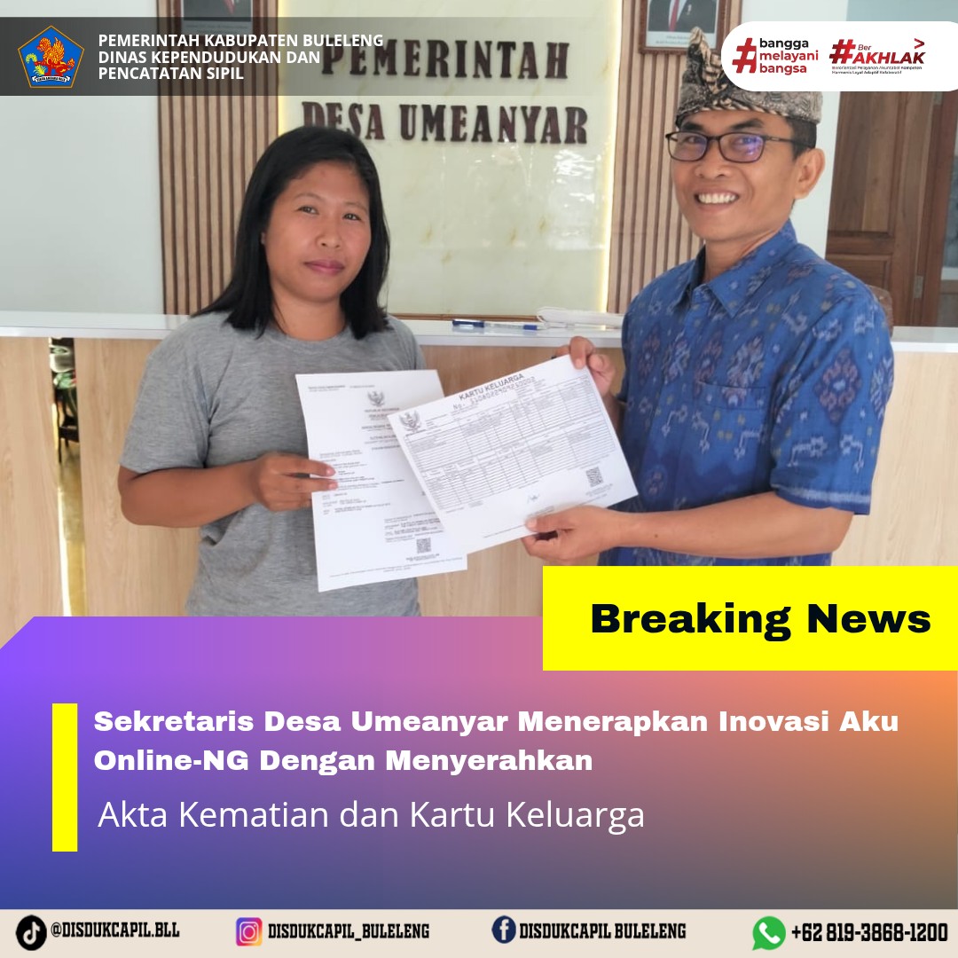 Pemerintah Kabupaten Buleleng melalui Dinas Kependudukan dan Pecatatan Sipil (Disdukcapil) Kabupaten Buleleng memaksimalkan serta mempermudah pelayanan kependudukan masyarakat dengan beberapa inovasi, melalui aplikasi AKU Online-NG. Dimana dalam penerapan aplikasi Aku Online-NG tersebut masyarakat tidak perlu lagi datang ke Dinas Dukcapil untuk melakukan pelayanan langsung cukup dengan datang ke Desa nanti akan dibantu oleh operator Desa masing-masing. Di Desa Umeanyar Kecamatan Seririt telah diserahkan dokumen kependudukan berupa Akta Kematian atas nama I Komang Suarmika dan Kartu Keluarga atas nama Kadek Onik Ana Pertiwi oleh Sekretaris Desa Umeanyar Kecamatan Seririt, Kamis (2/10).