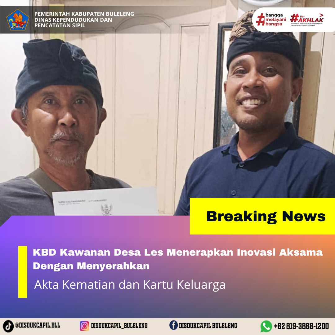 Pemerintah Kabupaten Buleleng melalui Dinas Kependudukan dan Pecatatan Sipil (Disdukcapil) Kabupaten Buleleng memaksimalkan serta mempermudah pelayanan kependudukan masyarakat dengan beberapa inovasi, yakni BALITA (Bayi Lahir Berakta), NYAKSI (Menyerahkan Akta Kawin Saat Acara Perkawinan) dan AKSAMA ( Akta Kematian Diserahkan Saat Masih Berduka) melalui aplikasi Aku Online. Di Desa Les Kecamatan Tejakula, telah diterapkan program Aksama (Akta Kematian Diserahkan Saat Masih Berduka) yang dilakukan secara langsung oleh Kelian Banjar Dinas Kawanan, Desa Les dengan menyerahkan Akta Kematian dan Kartu Keluarga kepada Keluarga Almarhum yang beralamat Banjar Dinas Kawanan Desa Les, Minggu (16/11).