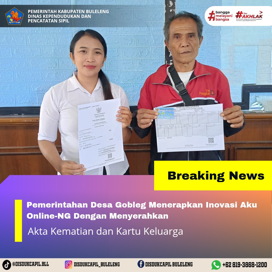 Pemerintah Kabupaten Buleleng melalui Dinas Kependudukan dan Pecatatan Sipil (Disdukcapil) Kabupaten Buleleng memaksimalkan serta mempermudah pelayanan kependudukan masyarakat dengan beberapa inovasi, melalui aplikasi AKU Online-NG. Dimana dalam penerapan aplikasi Aku Online-NG tersebut masyarakat tidak perlu lagi datang ke Dinas Dukcapil untuk melakukan pelayanan langsung cukup dengan datang ke Desa nanti akan dibantu oleh operator Desa masing-masing. Di Desa Gobleg Kecamatan Banjar, telah diserahkan dokumen kependudukan berupa Akta Kematian dan Kartu Keluarga atas nama Nyoman Gede Sumatra yang diserahkan langsung oleh staf administrasi Desa Gobleg bertempat di Kantor Perbekel Desa Gobleg, Kecamatan Banjar, Kabupaten Buleleng, Rabu (24/9).