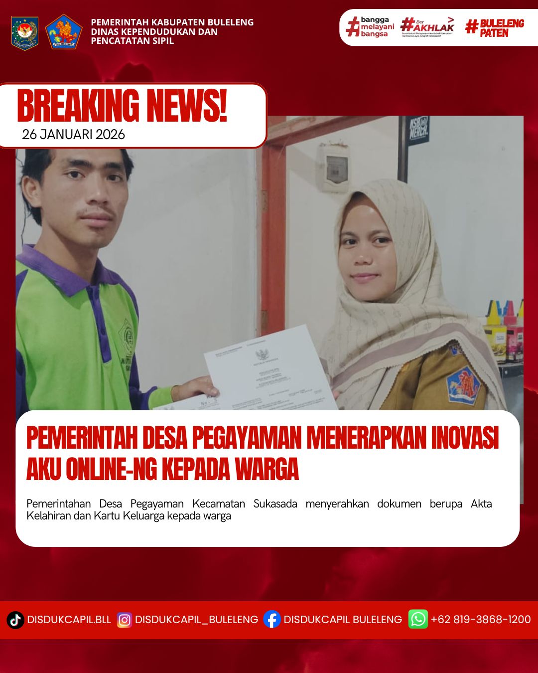 Pemerintah Kabupaten Buleleng melalui Dinas Kependudukan dan Pecatatan Sipil (Disdukcapil) Kabupaten Buleleng memaksimalkan serta mempermudah pelayanan kependudukan masyarakat dengan beberapa inovasi, melalui aplikasi AKU Online-NG. Dimana dalam penerapan aplikasi Aku Online-NG tersebut masyarakat tidak perlu lagi datang ke Dinas Dukcapil untuk melakukan pelayanan langsung cukup dengan datang ke Desa nanti akan dibantu oleh operator Desa masing-masing. Di Desa Pegayaman Kecamatan Sukasada, telah diserahkan dokumen kependudukan berupa Akta Kelahiran dan Kartu Keluarga kepada warga atas nama RIMA WAHYU SAPUTRA yang beralamat di Banjar Dinas Kubu Desa Pegayaman yang diserahkan langsung oleh Kasi Pemerintahan Desa Pegayaman, Senin (26/1).
