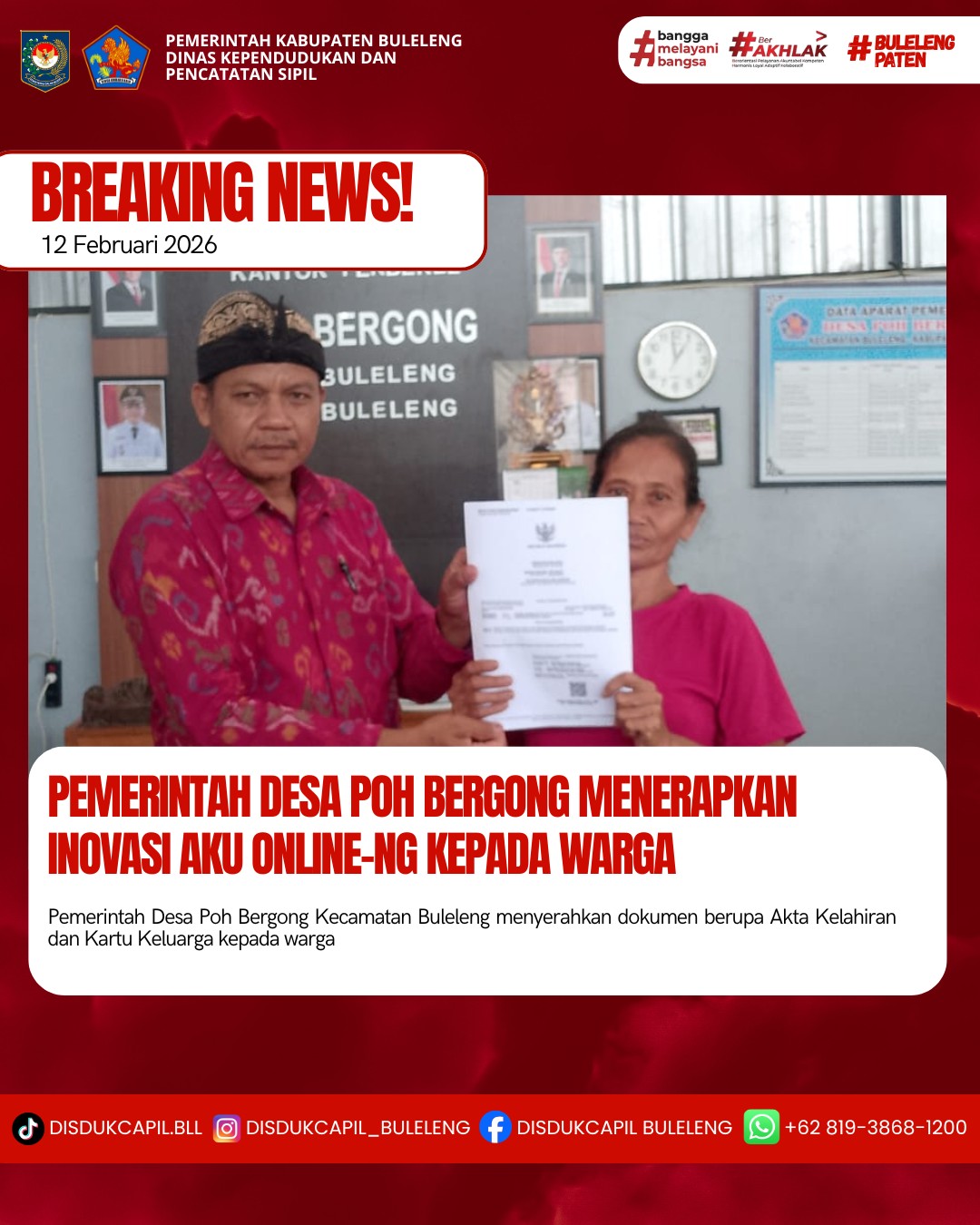 Pemerintah Kabupaten Buleleng melalui Dinas Kependudukan dan Pecatatan Sipil (Disdukcapil) Kabupaten Buleleng memaksimalkan serta mempermudah pelayanan kependudukan masyarakat dengan beberapa inovasi, melalui aplikasi AKU Online. Dimana dalam penerapan aplikasi Aku Online tersebut masyarakat tidak perlu lagi datang ke Dinas Dukcapil untuk melakukan pelayanan langsung cukup dengan datang ke Desa nanti akan dibantu oleh operator Desa masing-masing. Di Desa Poh Bergong Kecamatan Buleleng telah diserahkan dokumen kependudukan berupa Akta Kelahiran dan Kartu Keluarga yang diserahkan langsung oleh Sekretaris Desa Poh Bergong Kecamatan Buleleng, Kamis (12/2).