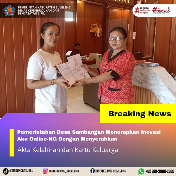 Pemerintah Kabupaten Buleleng melalui Dinas Kependudukan dan Pecatatan Sipil (Disdukcapil) Kabupaten Buleleng memaksimalkan serta mempermudah pelayanan kependudukan masyarakat dengan beberapa inovasi, melalui aplikasi AKU Online-NG. Dimana dalam penerapan aplikasi Aku Online-NG tersebut masyarakat tidak perlu lagi datang ke Dinas Dukcapil untuk melakukan pelayanan langsung cukup dengan datang ke Desa nanti akan dibantu oleh operator Desa masing-masing. Di Desa Sambangan Kecamatan Sukasada, telah diserahkan dokumen kependudukan berupa Akta Kelahiran atas nama I Kadek Kevin Dwipanaya dan Kartu Keluarga atas nama I Komang Sutrisna diserahkan oleh Kasi Pemerintahan Desa Sambangan bertempat di Kantor Perbekel Desa Sambangan, Kecamatan Sukasada, Kabupaten Buleleng, Selasa (30/12).