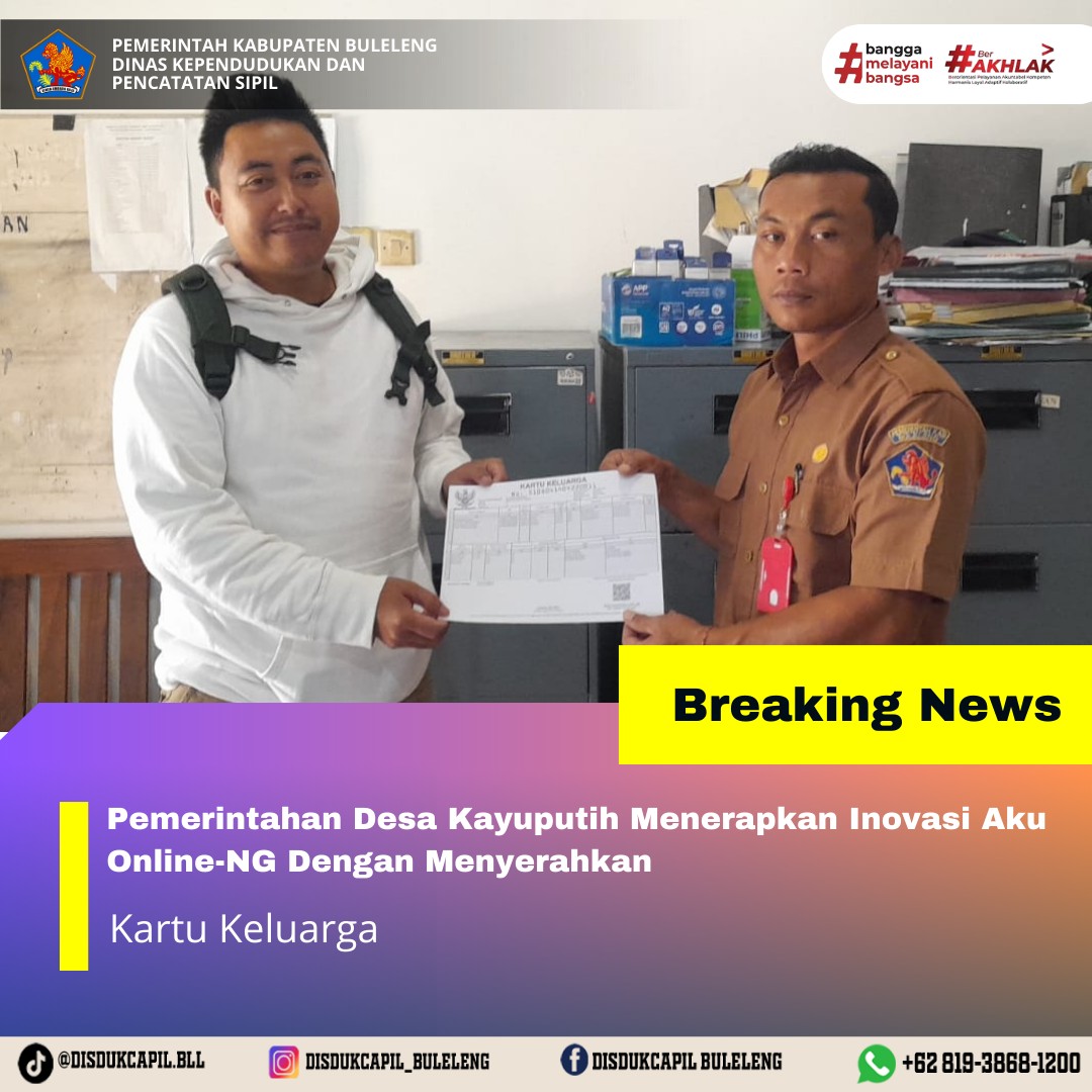 Pemerintah Kabupaten Buleleng melalui Dinas Kependudukan dan Pecatatan Sipil (Disdukcapil) Kabupaten Buleleng memaksimalkan serta mempermudah pelayanan kependudukan masyarakat dengan beberapa inovasi, melalui aplikasi AKU Online-NG. Dimana dalam penerapan aplikasi Aku Online-NG tersebut masyarakat tidak perlu lagi datang ke Dinas Dukcapil untuk melakukan pelayanan langsung cukup dengan datang ke Desa nanti akan dibantu oleh operator Desa masing-masing. Di Desa Kayuputih Kecamatan Banjar, telah diserahkan dokumen kependudukan berupa Kartu Keluarga atas nama KOMANG SELAMET warga Banjar Dinas Tabog, Desa Kayuputih Kecamatan Banjar yang diserahkan secara langsung oleh Pemerintahan Desa Kayuputih Kecamatan Banjar, Senin (29/12).