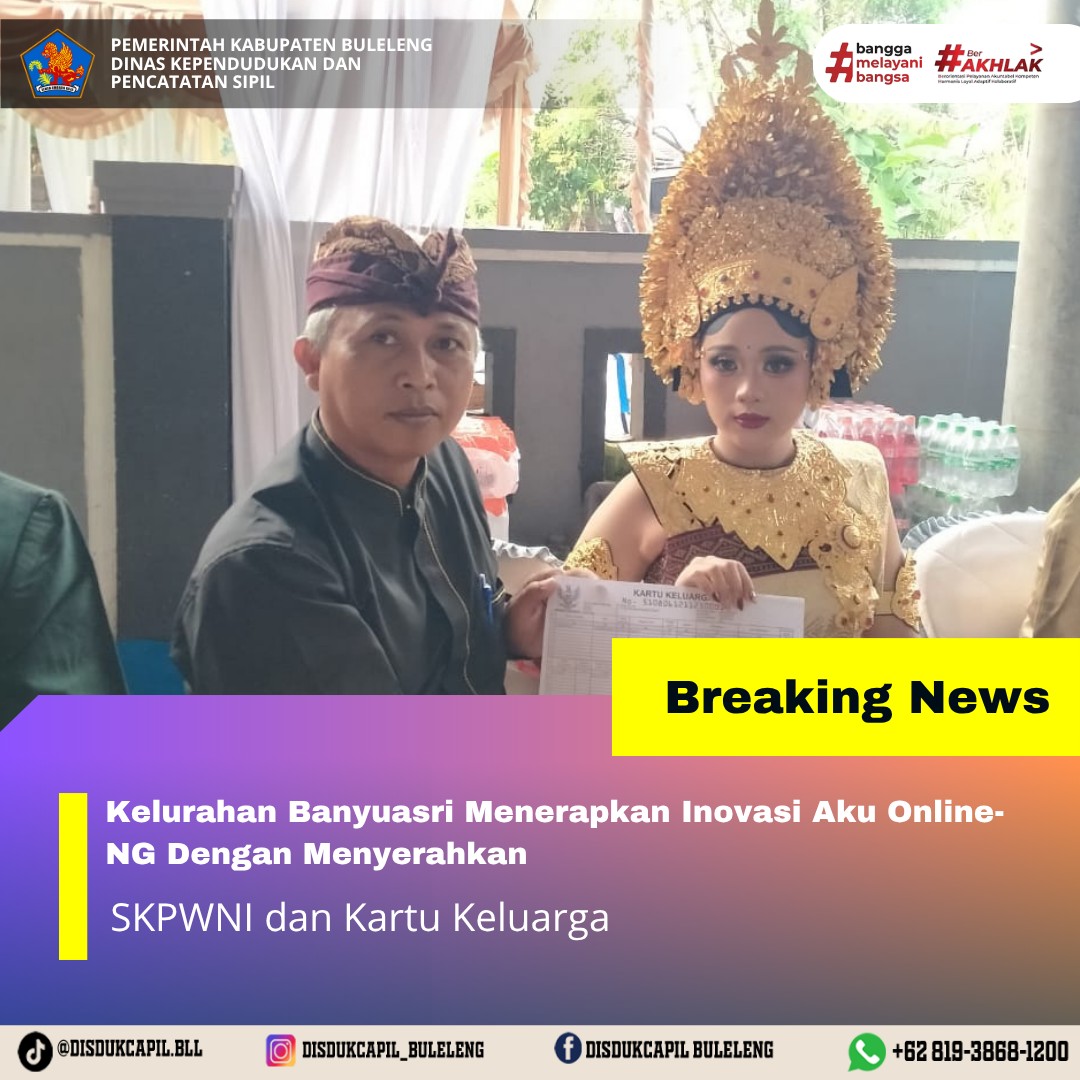 Pemerintah Kabupaten Buleleng melalui Dinas Kependudukan dan Pecatatan Sipil (Disdukcapil) Kabupaten Buleleng memaksimalkan serta mempermudah pelayanan kependudukan masyarakat dengan beberapa inovasi, melalui aplikasi AKU Online-NG. Dimana dalam penerapan aplikasi Aku Online-NG tersebut masyarakat tidak perlu lagi datang ke Dinas Dukcapil untuk melakukan pelayanan langsung cukup dengan datang ke Desa nanti akan dibantu oleh operator Desa masing-masing. Di Kelurahan Banyuning Kecamatan Buleleng, telah diserahkan dokumen kependudukan berupa SKPWNI kepada mempelai wanita atas nama Ayudia Salwa dan Kartu Keluarga yang diserahkan secara langsung oleh Kaling Kelurahan Banyuning Kecamatan Buleleng Ketut Suardana, Kamis (13/11).