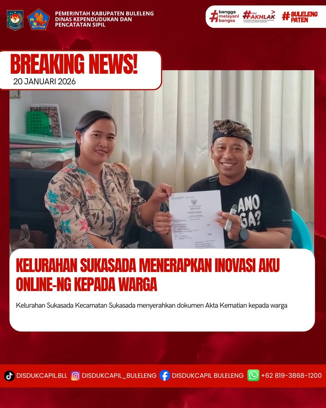 Pemerintah Kabupaten Buleleng melalui Dinas Kependudukan dan Pecatatan Sipil (Disdukcapil) Kabupaten Buleleng memaksimalkan serta mempermudah pelayanan kependudukan masyarakat dengan beberapa inovasi, melalui aplikasi AKU Online-NG. Dimana dalam penerapan aplikasi Aku Online-NG tersebut masyarakat tidak perlu lagi datang ke Dinas Dukcapil untuk melakukan pelayanan langsung cukup dengan datang ke Desa nanti akan dibantu oleh operator Desa masing-masing. Di Kelurahan Sukasada Kecamatan Sukasada, telah diserahkan dokumen kependudukan berupa Akta Kematian atas nama Made Rejani warga Lingkungan Bakung, Kelurahan Sukasada yang diserahkan langsung oleh Operator Kelurahan Sukasada Kecamatan Sukasada, Kabupaten Buleleng, Selasa (20/1).