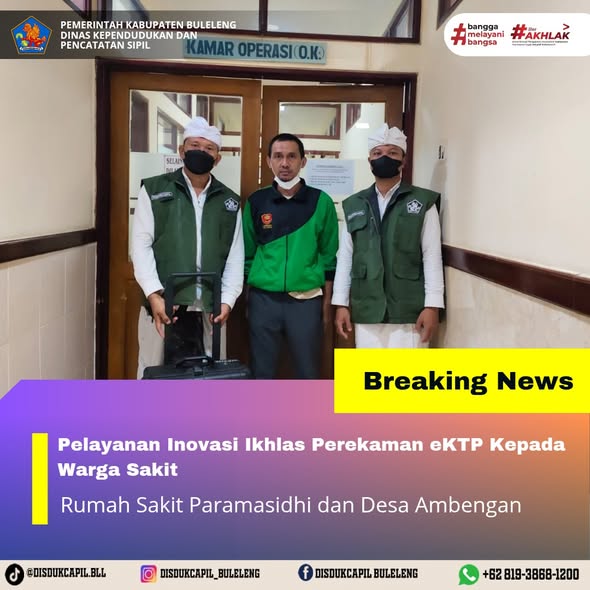 Pada hari ini Kamis, 4 Desember 2025 Dinas Kependudukan dan Pencatatan Sipil Kabupaten Buleleng melaksanakan penerapan Inovasi Ikhlas dengan melakukan jemput bola kepada masyarakat untuk melakukan perekaman KTP-El kepada warga Lansia di Desa Ambengan dan RS Paramasidhi sebanyak 2 orang atas nama Kadek Rastika Yasa (ODGJ) dan MUHDHALIFAH (sakit). Diharapkan dengan adanya penerapan Inovasi Ikhlas ini bisa mempermudah masyarakat yang terkendala usia dan sakit tetap bisa melakukan perekaman KTP-EL.