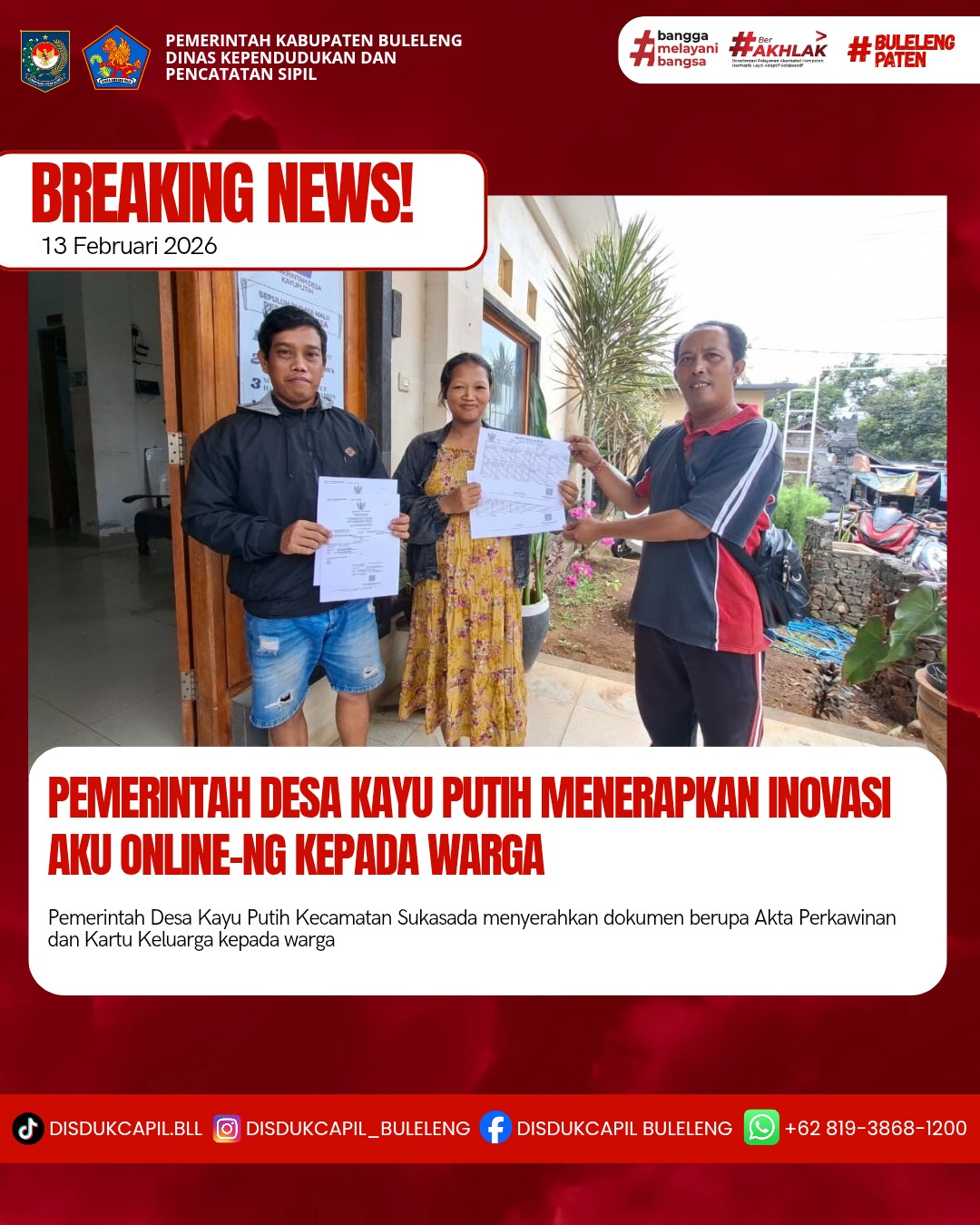 Pemerintah Kabupaten Buleleng melalui Dinas Kependudukan dan Pecatatan Sipil (Disdukcapil) Kabupaten Buleleng memaksimalkan serta mempermudah pelayanan kependudukan masyarakat dengan beberapa inovasi, melalui aplikasi AKU Online-NG. Dimana dalam penerapan aplikasi Aku Online-NG tersebut masyarakat tidak perlu lagi datang ke Dinas Dukcapil untuk melakukan pelayanan langsung cukup dengan datang ke Desa nanti akan dibantu oleh operator Desa masing-masing. Di Desa Kayu Putih Kecamatan Sukasada, telah diserahkan dokumen kependudukan berupa Akta Perkawinan atas nama Komang Kertia Astradi dan Luh Putu Sri Savitri dan Kartu Keluarga atas nama Komang Kertia Astradi dan Made Winarka warga Banjar Dinas Bhuanasari, Desa Kayu Putih, Kecamatan Sukasada yang diserahkan secara langsung oleh Kelian Banjar Dinas Panti Desa Kayu Putih Kecamatan Sukasada, Jumat (13/2).