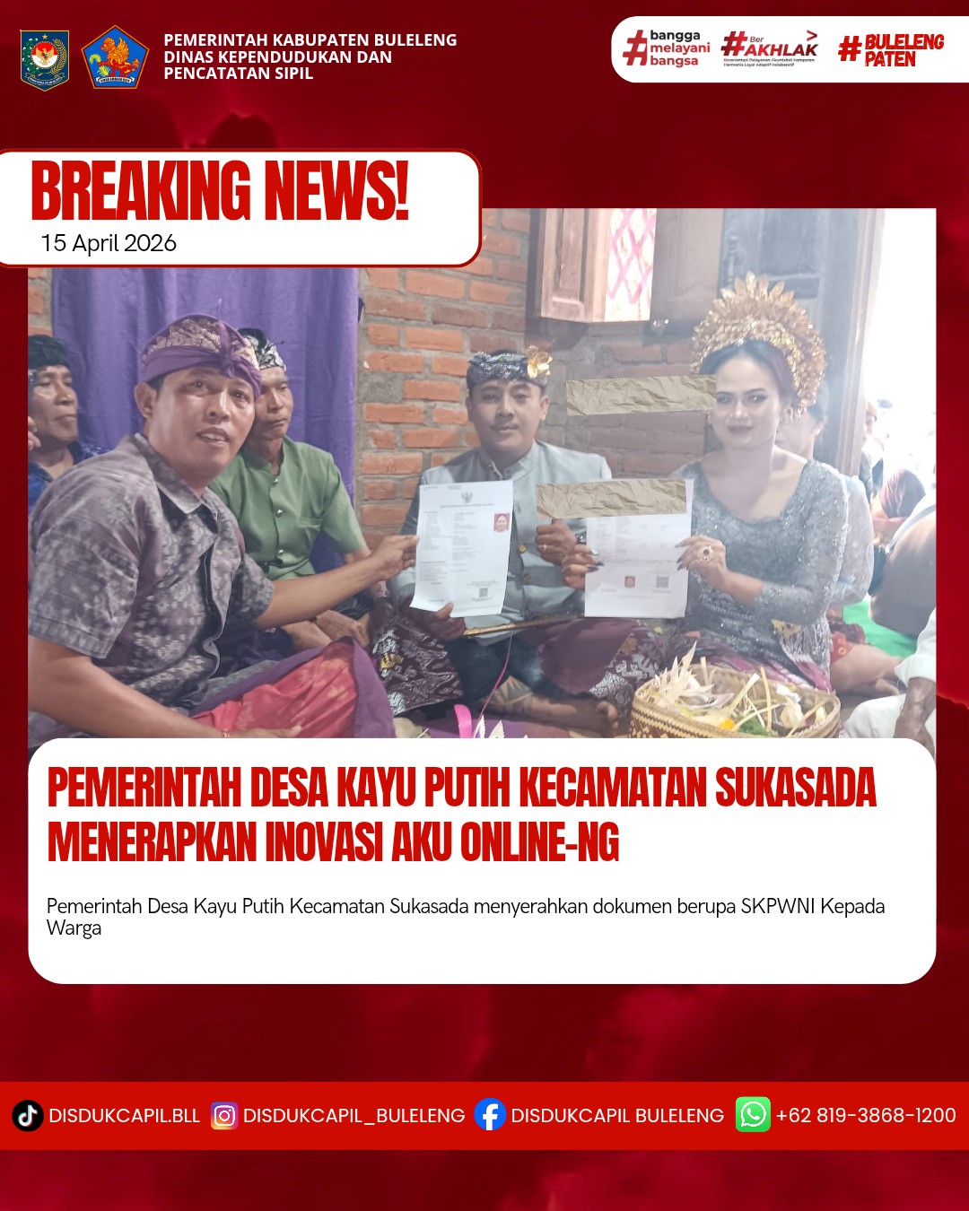 Pemerintah Kabupaten Buleleng melalui Dinas Kependudukan dan Pecatatan Sipil (Disdukcapil) Kabupaten Buleleng memaksimalkan serta mempermudah pelayanan kependudukan masyarakat dengan beberapa inovasi, melalui aplikasi AKU Online-NG. Dimana dalam penerapan aplikasi Aku Online-NG tersebut masyarakat tidak perlu lagi datang ke Dinas Dukcapil untuk melakukan pelayanan langsung cukup dengan datang ke Desa nanti akan dibantu oleh operator Desa masing-masing. Di Desa Kayu Putih Kecamatan Sukasada, telah diserahkan dokumen kependudukan berupa SKPWNI atas nama Luh Prama Yuri Anjani warga Banjar Dinas Panti akan pindah ke Tabanan yang diserahkan secara langsung oleh Kelian Banjar Dinas Panti Desa Kayu Putih Kecamatan Sukasada, Rabu (15/4).