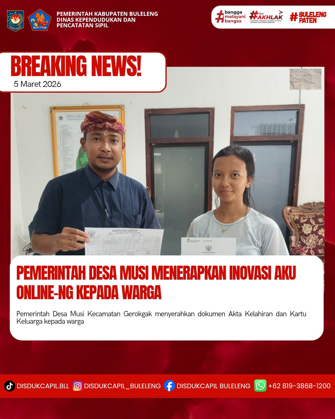 Pemerintah Kabupaten Buleleng melalui Dinas Kependudukan dan Pecatatan Sipil (Disdukcapil) Kabupaten Buleleng memaksimalkan serta mempermudah pelayanan kependudukan masyarakat dengan beberapa inovasi, melalui aplikasi AKU Online-NG. Dimana dalam penerapan aplikasi Aku Online-NG tersebut masyarakat tidak perlu lagi datang ke Dinas Dukcapil untuk melakukan pelayanan langsung cukup dengan datang ke Desa nanti akan dibantu oleh operator Desa masing-masing. Di Desa Musi Kecamatan Gerokgak, telah diserahkan dokumen kependudukan berupa Akta Perkawinan, Akta Kelahiran dan Kartu Keluarga yang diserahkan langsung oleh Kasi Pemerintahan Desa Musi Kecamatan Gerokgak, Kabupaten Buleleng, Kamis (5/3).
