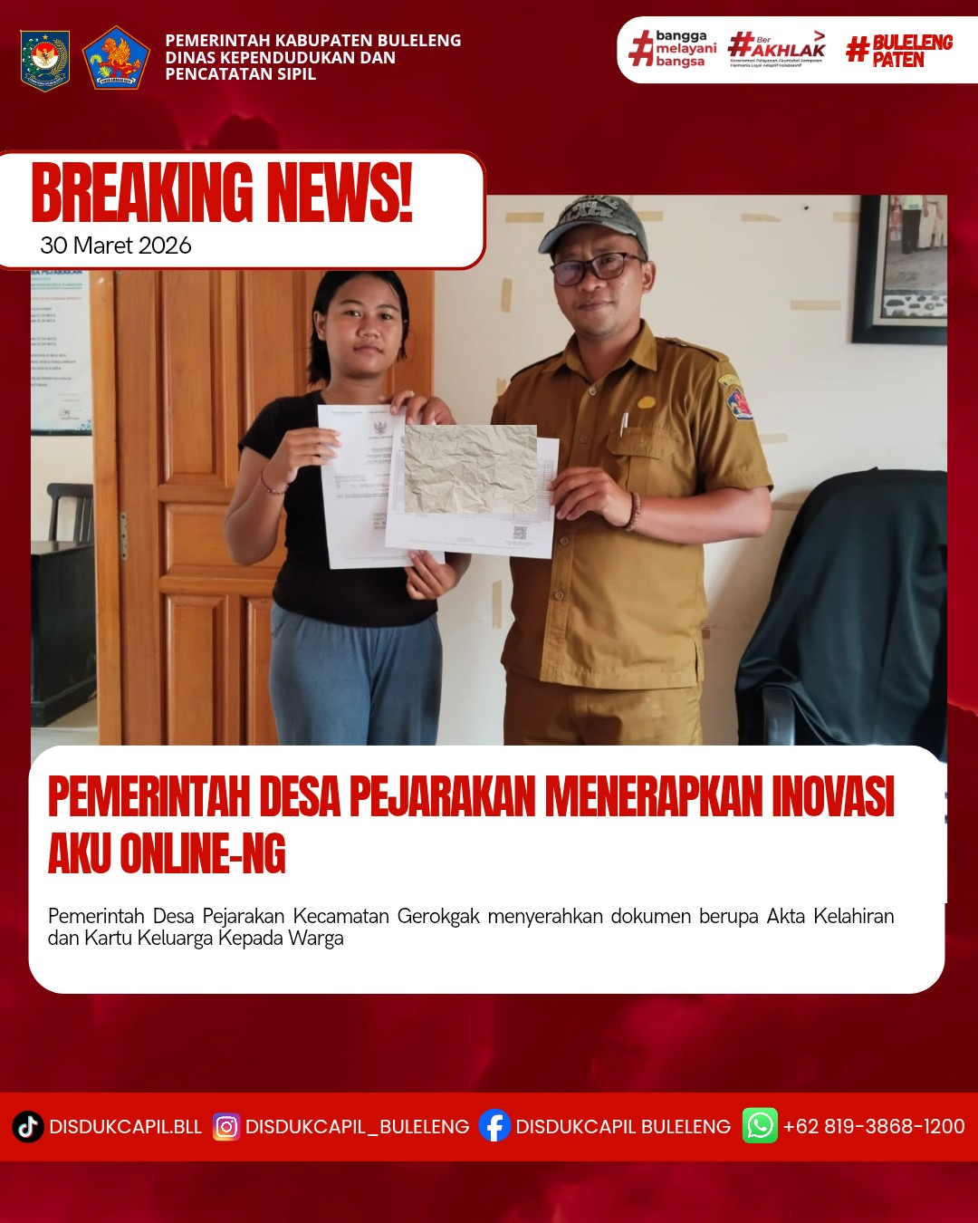 Pemerintah Kabupaten Buleleng melalui Dinas Kependudukan dan Pecatatan Sipil (Disdukcapil) Kabupaten Buleleng memaksimalkan serta mempermudah pelayanan kependudukan masyarakat dengan beberapa inovasi, melalui aplikasi AKU Online-NG. Dimana dalam penerapan aplikasi Aku Online-NG tersebut masyarakat tidak perlu lagi datang ke Dinas Dukcapil untuk melakukan pelayanan langsung, cukup dengan datang ke Desa nanti akan dibantu oleh operator Desa masing-masing. Di Desa Pejarakan Kecamatan Gerokgak, telah diserahkan dokumen kependudukan berupa Akta Kelahiran atas nama Putu Ayu Juniasih dan Kartu Keluarga atas nama Made Mertayana yang diserahkan langsung oleh Pemerintahan Desa Pejarakan bertempat di Kantor Perbekel Desa Pejarakan, Kecamatan Gerokgak, Kabupaten Buleleng, Senin (30/3).