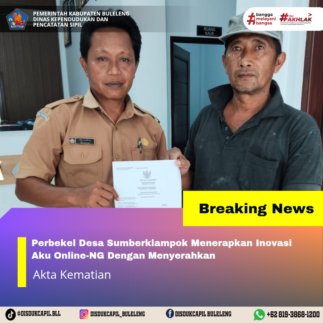 Pemerintah Kabupaten Buleleng melalui Dinas Kependudukan dan Pecatatan Sipil (Disdukcapil) Kabupaten Buleleng memaksimalkan serta mempermudah pelayanan kependudukan masyarakat dengan beberapa inovasi, melalui aplikasi AKU Online. Dimana dalam penerapan aplikasi Aku Online tersebut masyarakat tidak perlu lagi datang ke Dinas Dukcapil untuk melakukan pelayanan langsung cukup dengan datang ke Desa nanti akan dibantu oleh operator Desa masing-masing. Di Desa Sumberklampok Kecamatan Gerokgak telah diserahkan dokumen kependudukan berupa Akta Kematian atas nama Asemmah yang diserahkan langsung oleh Kadus Bd.Tegalbunder Desa Sumberklampok, Senin (3/11).