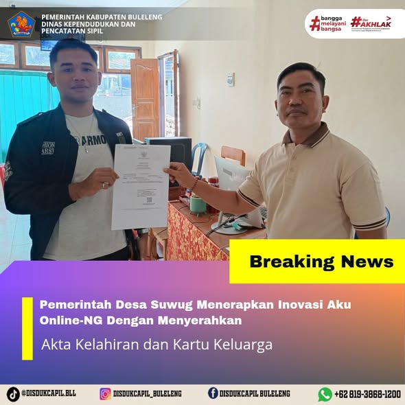 Pemerintah Kabupaten Buleleng melalui Dinas Kependudukan dan Pecatatan Sipil (Disdukcapil) Kabupaten Buleleng memaksimalkan serta mempermudah pelayanan kependudukan masyarakat dengan beberapa inovasi, melalui aplikasi AKU Online-NG. Dimana dalam penerapan aplikasi Aku Online-NG tersebut masyarakat tidak perlu lagi datang ke Dinas Dukcapil untuk melakukan pelayanan langsung cukup dengan datang ke Desa nanti akan dibantu oleh operator Desa masing-masing. Di Desa Suwug Kecamatan Sawan, Bapak Perbekel Desa suwug telah menyerahkan dokumen kependudukan berupa Akta Kelahiran dan Kartu Keluarga yang diserahkan secara lansung oleh Pemerintahan Desa Suwug, Jumat (7/11).