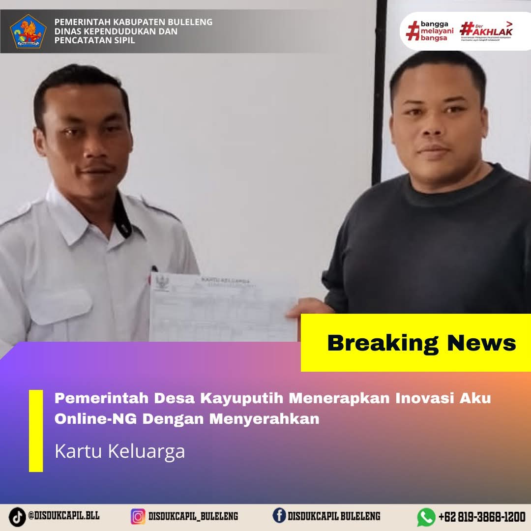 Pemerintah Kabupaten Buleleng melalui Dinas Kependudukan dan Pecatatan Sipil (Disdukcapil) Kabupaten Buleleng memaksimalkan serta mempermudah pelayanan kependudukan masyarakat dengan beberapa inovasi, melalui aplikasi AKU Online-NG. Dimana dalam penerapan aplikasi Aku Online-NG tersebut masyarakat tidak perlu lagi datang ke Dinas Dukcapil untuk melakukan pelayanan langsung cukup dengan datang ke Desa nanti akan dibantu oleh operator Desa masing-masing. Di Desa Kayuputih Kecamatan Banjar, telah diserahkan dokumen kependudukan berupa Kartu Keluarga atas nama Nyoman Arca yang diserahkan secara langsung oleh Staf Desa Kayuputih Kecamatan Banjar, Rabu (3/12).