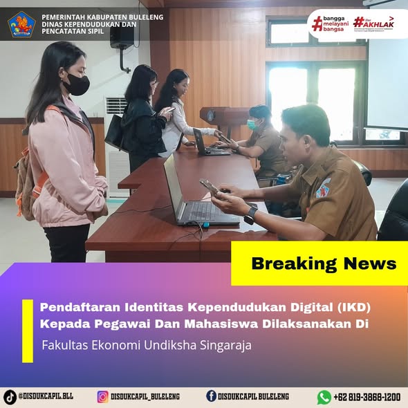 Menerapkan aturan pemerintah tersebut, Dinas Kependudukan dan Pencatatan Sipil Kabupaten Buleleng menyelenggarakan Pendaftaran Identitas Kependudukan Digital ke sekolah-sekolah, Dinas, Lembaga dan Perusahaan secara bergilir setiap harinya. Kali ini pelaksanaan pendaftaran Identitas Kependudukan Digital kepada pegawai dan Mahasiswa yang dilaksanakan di FE Undiksha Singaraja, Kamis (3/11).