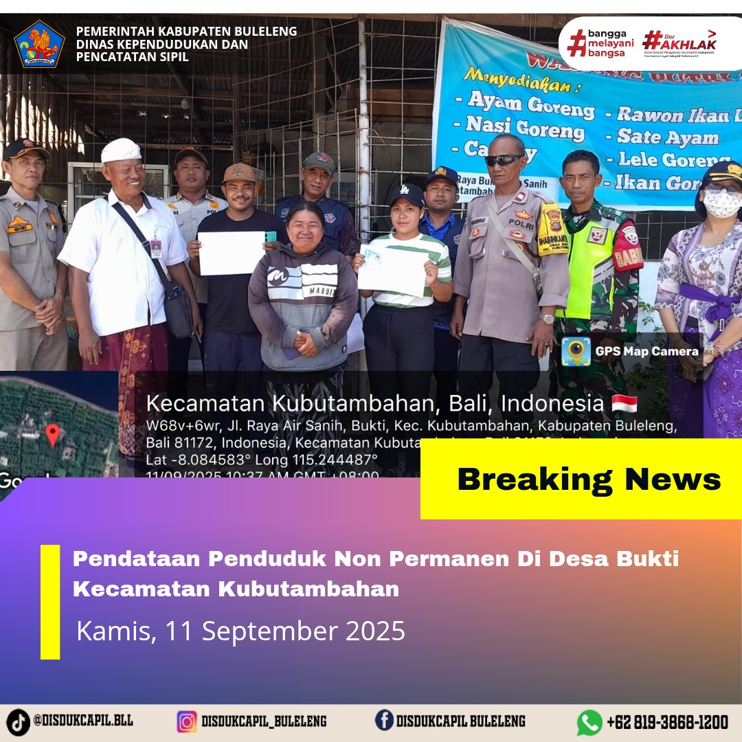 Kali ini Kamis, 11 September 2025, Dinas Kependudukan dan Pencatatan Sipil Kabupaten Buleleng melaksanakan kegiatan pendataan penduduk Non Permanen di Desa Bukti Kecamatan Kubutambahan. Dari pendataan penduduk kali ini didapatkan hasil :