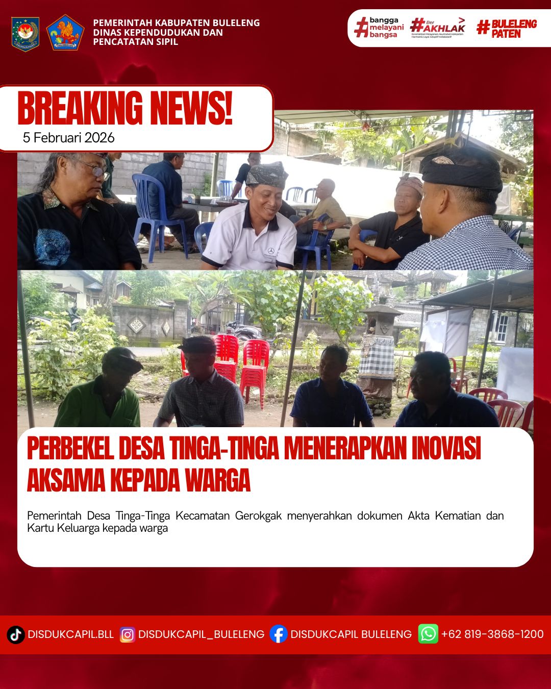 Pemerintah Kabupaten Buleleng melalui Dinas Kependudukan dan Pecatatan Sipil (Disdukcapil) Kabupaten Buleleng memaksimalkan serta mempermudah pelayanan kependudukan masyarakat dengan beberapa inovasi, yakni BALITA (Bayi Lahir Berakta), NYAKSI (Menyerahkan Akta Kawin Saat Acara Perkawinan) dan AKSAMA ( Akta Kematian Diserahkan Saat Masih Berduka) melalui aplikasi Aku Online. Di Desa Tinga-Tinga Kecamatan Gerokgak, telah diterapkan program Aksama (Akta Kematian Diserahkan Saat Masih Berduka) yang dilakukan secara langsung oleh Perbekel Desa Tinga-Tinga I Komang Adi Wirawan di dampingi Kasi Pelayanan dan Kelian Banjar Dinas menyerahkan Akta Kematian di dua tempat berbeda, agenda pertama dilaksanakan di BD.Kembang Udaya dengan penyerahan Akta Kematian dan Kartu Keluarga baru dan dana sungkawa kepada warga atas nama Wayan Sandat. Agenda kedua dilaksanakan di BD. Bubunan berupa penyerahan Akta Kematian dan dana sungkawa kepada warga atas nama Nyoman Parning, Kamis (5/2).