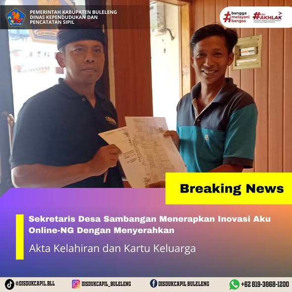 Pemerintah Kabupaten Buleleng melalui Dinas Kependudukan dan Pecatatan Sipil (Disdukcapil) Kabupaten Buleleng memaksimalkan serta mempermudah pelayanan kependudukan masyarakat dengan beberapa inovasi, melalui aplikasi AKU Online-NG. Dimana dalam penerapan aplikasi Aku Online-NG tersebut masyarakat tidak perlu lagi datang ke Dinas Dukcapil untuk melakukan pelayanan langsung cukup dengan datang ke Desa nanti akan dibantu oleh operator Desa masing-masing. Di Desa Sambangan Kecamatan Sukasada, telah diserahkan dokumen kependudukan berupa Akta Kelahiran atas nama Komang Tri Septiani dan Kartu Keluarga atas nama Nyoman Widiada diserahkan oleh Sekretaris Desa Sambangan bertempat di Kantor Perbekel Desa Sambangan, Kecamatan Sukasada, Kabupaten Buleleng, Rabu (31/12).