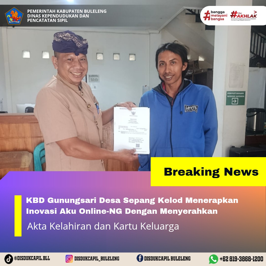 Pemerintah Kabupaten Buleleng melalui Dinas Kependudukan dan Pecatatan Sipil (Disdukcapil) Kabupaten Buleleng memaksimalkan serta mempermudah pelayanan kependudukan masyarakat dengan beberapa inovasi, melalui aplikasi AKU Online. Dimana dalam penerapan aplikasi Aku Online tersebut masyarakat tidak perlu lagi datang ke Dinas Dukcapil untuk melakukan pelayanan langsung cukup dengan datang ke Desa nanti akan dibantu oleh operator Desa masing-masing. Di Desa Sepang Kelod Kecamatan Busungbiu telah diserahkan dokumen kependudukan berupa Akta Kelahiran dan Kartu Keluarga yang diserahkan oleh Kelian Banjar Dinas Gunungsari Desa Sepang Kelod Kecamatan Busungbiu, Jumat (26/9).