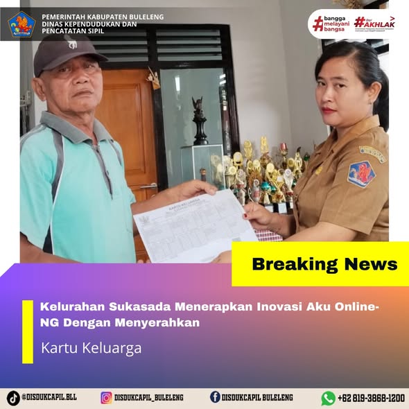 Pemerintah Kabupaten Buleleng melalui Dinas Kependudukan dan Pecatatan Sipil (Disdukcapil) Kabupaten Buleleng memaksimalkan serta mempermudah pelayanan kependudukan masyarakat dengan beberapa inovasi, melalui aplikasi AKU Online-NG. Dimana dalam penerapan aplikasi Aku Online-NG tersebut masyarakat tidak perlu lagi datang ke Dinas Dukcapil untuk melakukan pelayanan langsung cukup dengan datang ke Desa nanti akan dibantu oleh operator Desa masing-masing. Di Kelurahan Sukasada Kecamatan Sukasada, telah diserahkan dokumen kependudukan berupa Kartu Keluarga atas nama Ida Bagus Made Ariana warga Lingkungan Sangket, Kelurahan Sukasada yang diserahkan secara oleh operator Kelurahan Sukasada kepada warga, Senin (22/12).