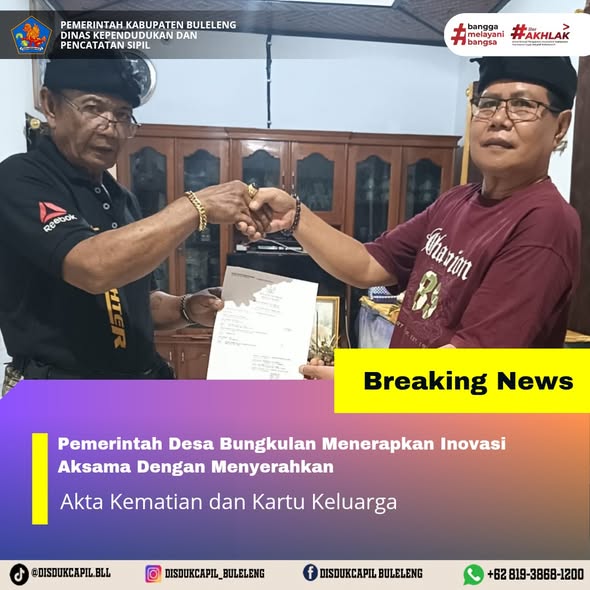 Pemerintah Kabupaten Buleleng melalui Dinas Kependudukan dan Pecatatan Sipil (Disdukcapil) Kabupaten Buleleng memaksimalkan serta mempermudah pelayanan kependudukan masyarakat dengan beberapa inovasi, yakni BALITA (Bayi Lahir Berakta), NYAKSI (Menyerahkan Akta Kawin Saat Acara Perkawinan) dan AKSAMA ( Akta Kematian Diserahkan Saat Masih Berduka) melalui aplikasi Aku Online-NG. Di Desa Bungkulan Kecamatan Sawan, telah diterapkan program Aksama (Akta Kematian Diserahkan Saat Masih Berduka) yang dilakukan secara langsung oleh Kelian Banjar Dinas Ancak, Desa Bungkulan dengan menyerahkan Akta Kematian dan Kartu Keluarga kepada keluarga almarhum di Desa Bungkulan, Senin (15/12).