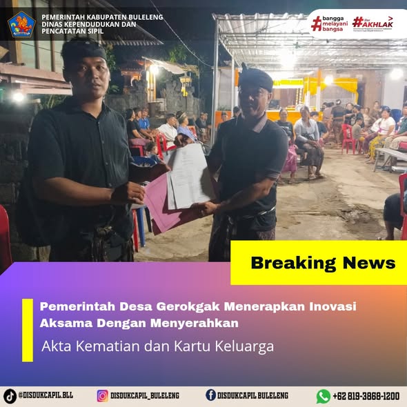 Pemerintah Kabupaten Buleleng melalui Dinas Kependudukan dan Pecatatan Sipil (Disdukcapil) Kabupaten Buleleng memaksimalkan serta mempermudah pelayanan kependudukan masyarakat dengan beberapa inovasi, yakni BALITA (Bayi Lahir Berakta), NYAKSI (Menyerahkan Akta Kawin Saat Acara Perkawinan) dan AKSAMA ( Akta Kematian Diserahkan Saat Masih Berduka) melalui aplikasi Aku Online. Di Desa Gerokgak Kecamatan Gerokgak, telah diterapkan program Aksama (Akta Kematian Diserahkan Saat Masih Berduka) yang dilakukan secara langsung oleh Kelian Banjar Dinas Gerokgak dengan menyerahkan Akta Kematian atas nama Wayan Sarka dan Kartu Keluarga Baru atas nama Nengah Seputri , di Desa Gerokgak, Kecamatan GerokgakKamis (10/11).