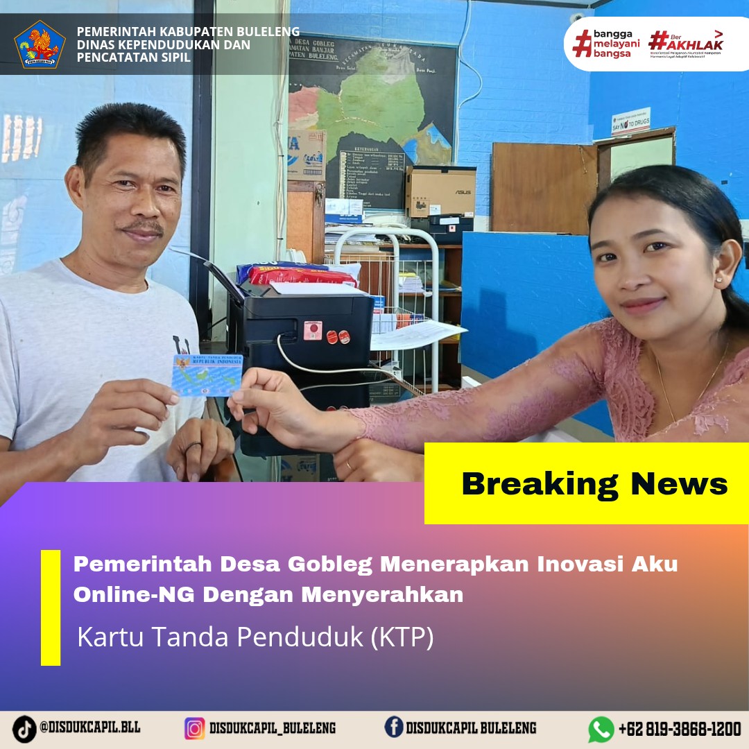 Pemerintah Kabupaten Buleleng melalui Dinas Kependudukan dan Pecatatan Sipil (Disdukcapil) Kabupaten Buleleng memaksimalkan serta mempermudah pelayanan kependudukan masyarakat dengan beberapa inovasi, melalui aplikasi AKU Online-NG. Dimana dalam penerapan aplikasi Aku Online-NG tersebut masyarakat tidak perlu lagi datang ke Dinas Dukcapil untuk melakukan pelayanan langsung cukup dengan datang ke Desa nanti akan dibantu oleh operator Desa masing-masing. Di Desa Gobleg Kecamatan Banjar, telah diserahkan dokumen kependudukan berupa Kartu Tanda Penduduk (KTP) atas nama Ketut Sarjana yang diserahkan langsung oleh staf administrasi Desa Gobleg bertempat di Kantor Perbekel Desa Gobleg, Kecamatan Banjar, Kabupaten Buleleng, Kamis (25/9).