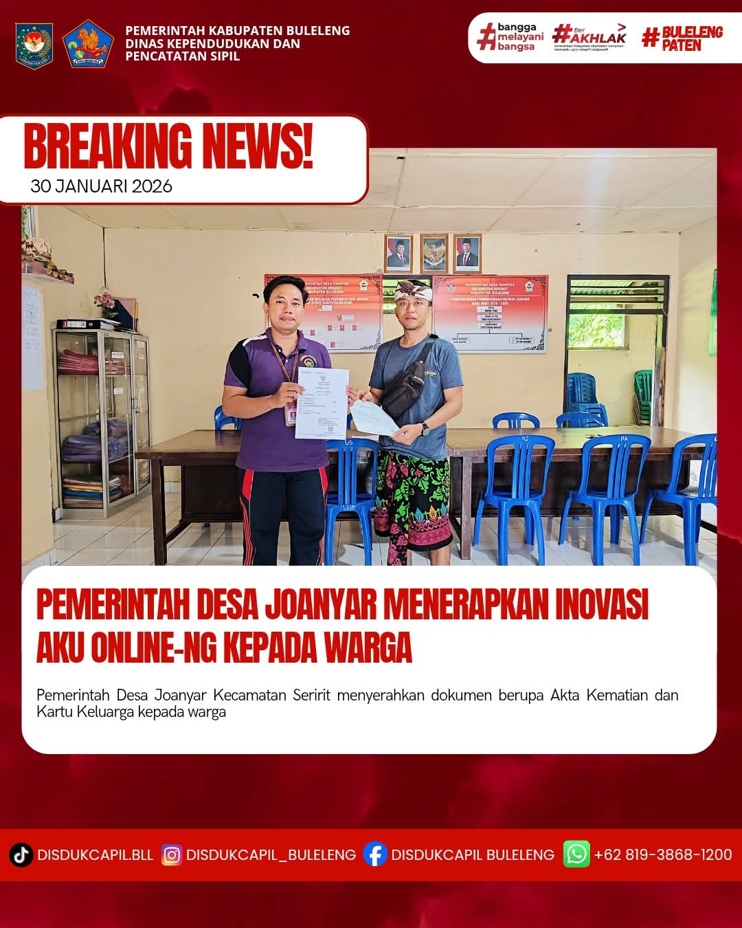 Pemerintah Kabupaten Buleleng melalui Dinas Kependudukan dan Pecatatan Sipil (Disdukcapil) Kabupaten Buleleng memaksimalkan serta mempermudah pelayanan kependudukan masyarakat dengan beberapa inovasi, melalui aplikasi AKU Online-NG. Dimana dalam penerapan aplikasi Aku Online-NG tersebut masyarakat tidak perlu lagi datang ke Dinas Dukcapil untuk melakukan pelayanan langsung cukup dengan datang ke Desa nanti akan dibantu oleh operator Desa masing-masing. Di Desa Joanyar Kecamatan Seririt, telah diserahkan dokumen kependudukan berupa Akta Kematian atas nama Ketut Lasdana dan Kartu Keluarga atas nama Made Kariani yang beralamat di Desa Joanyar yang diserahkan secara langsung oleh Kasi Pemerintahan Desa Joanyar Kecamatan Seririt, Jumat (30/1).
