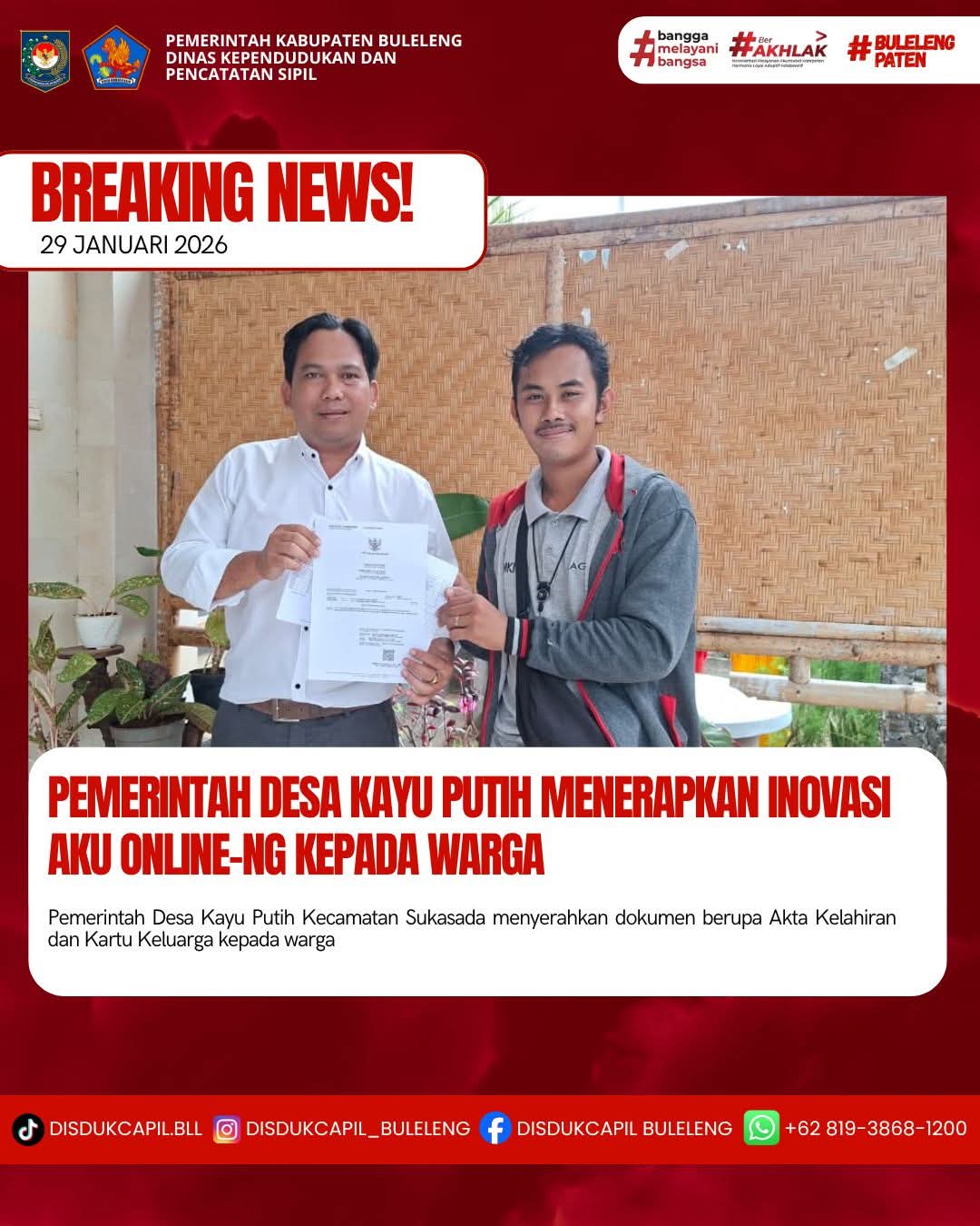 Pemerintah Kabupaten Buleleng melalui Dinas Kependudukan dan Pecatatan Sipil (Disdukcapil) Kabupaten Buleleng memaksimalkan serta mempermudah pelayanan kependudukan masyarakat dengan beberapa inovasi, melalui aplikasi AKU Online-NG. Dimana dalam penerapan aplikasi Aku Online-NG tersebut masyarakat tidak perlu lagi datang ke Dinas Dukcapil untuk melakukan pelayanan langsung cukup dengan datang ke Desa nanti akan dibantu oleh operator Desa masing-masing. Di Desa Kayu Putih Kecamatan Sukasada, telah diserahkan dokumen kependudukan berupa Akta Kelahiran atas nama Made Darma Santiyasa dan Kartu Keluarga atas Komang Agus Aditya warga Banjar Dinas Melaka, Desa Kayu Putih, Kecamatan Sukasada yang diserahkan secara langsung oleh Sekretaris Desa Kayu Putih Kecamatan Sukasada, Kamis (29/1).